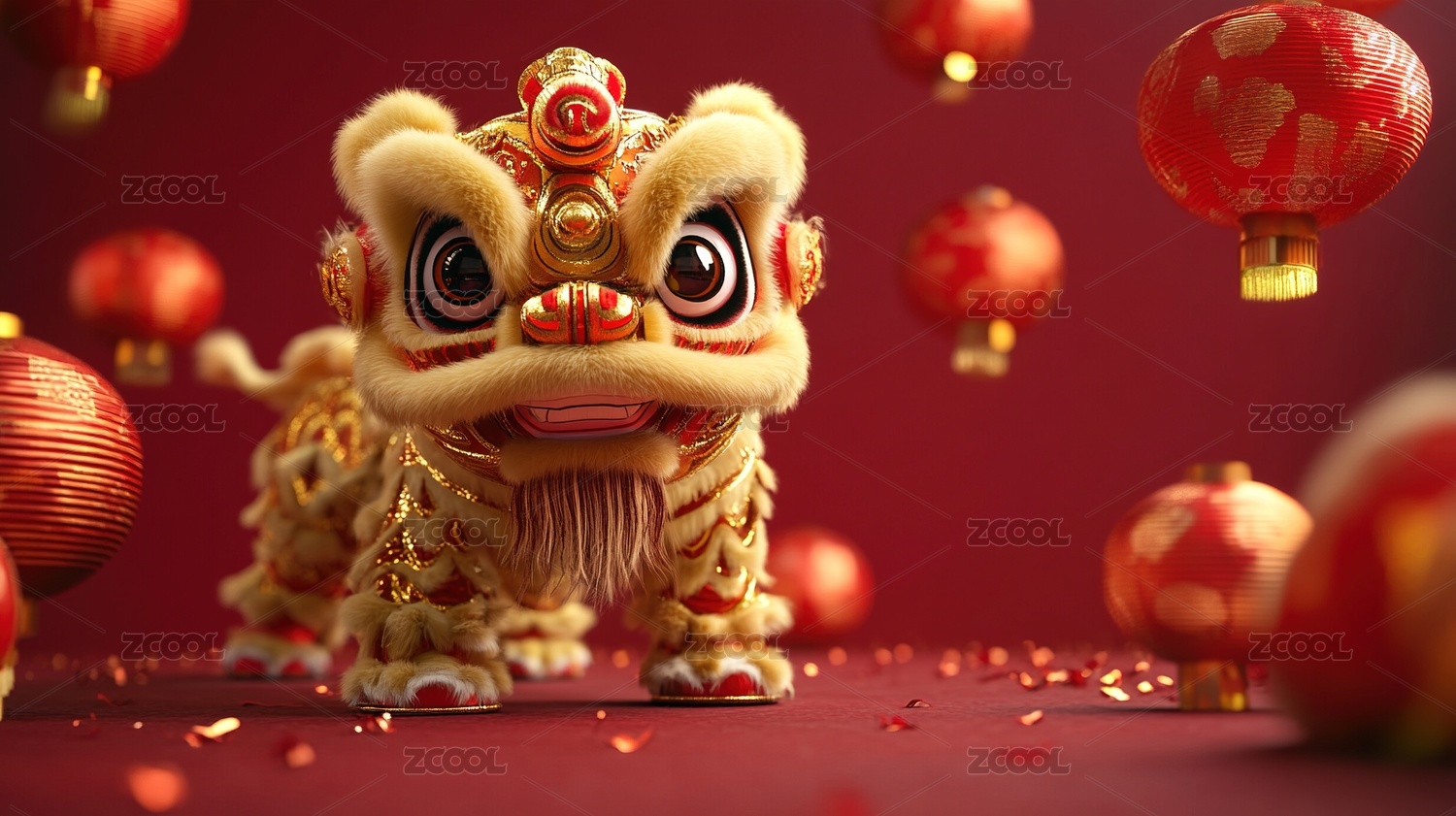 春节喜庆氛围下的可爱舞狮,寓意吉祥如意