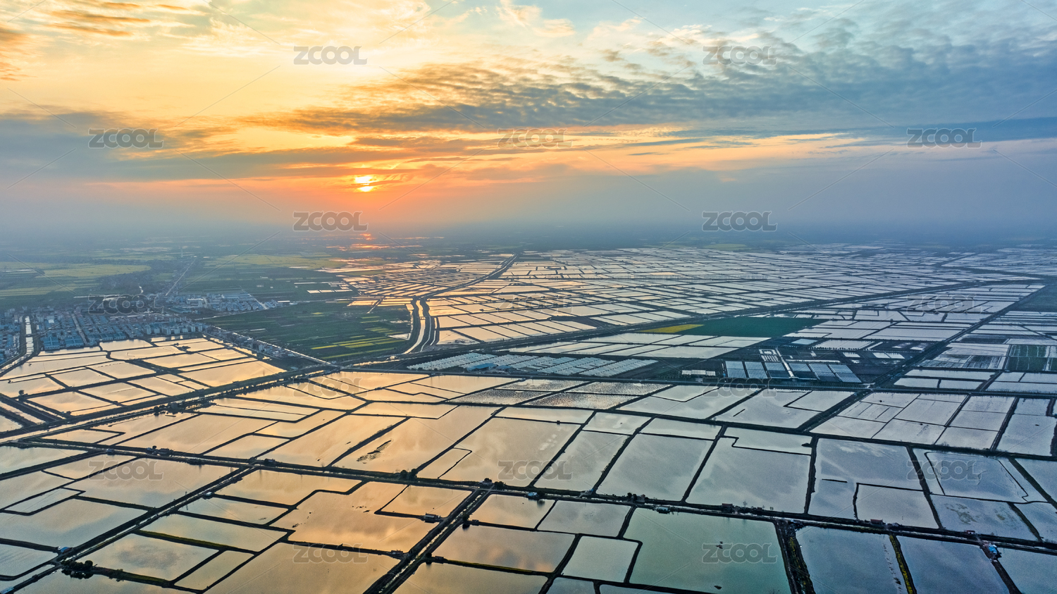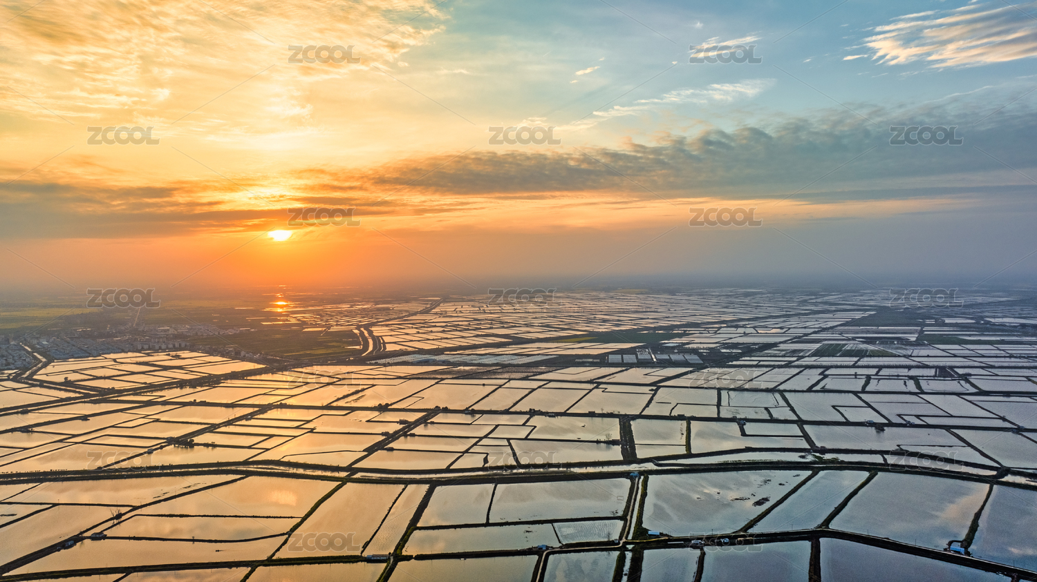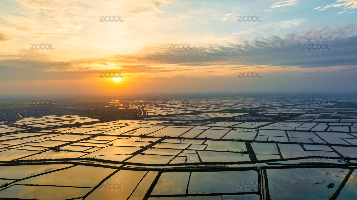 湖北江汉平原的连片养殖鱼塘与夕阳