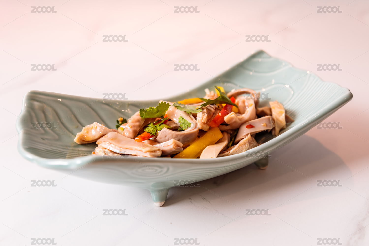 餐桌上一白瓷盘里的凉拌蛇皮