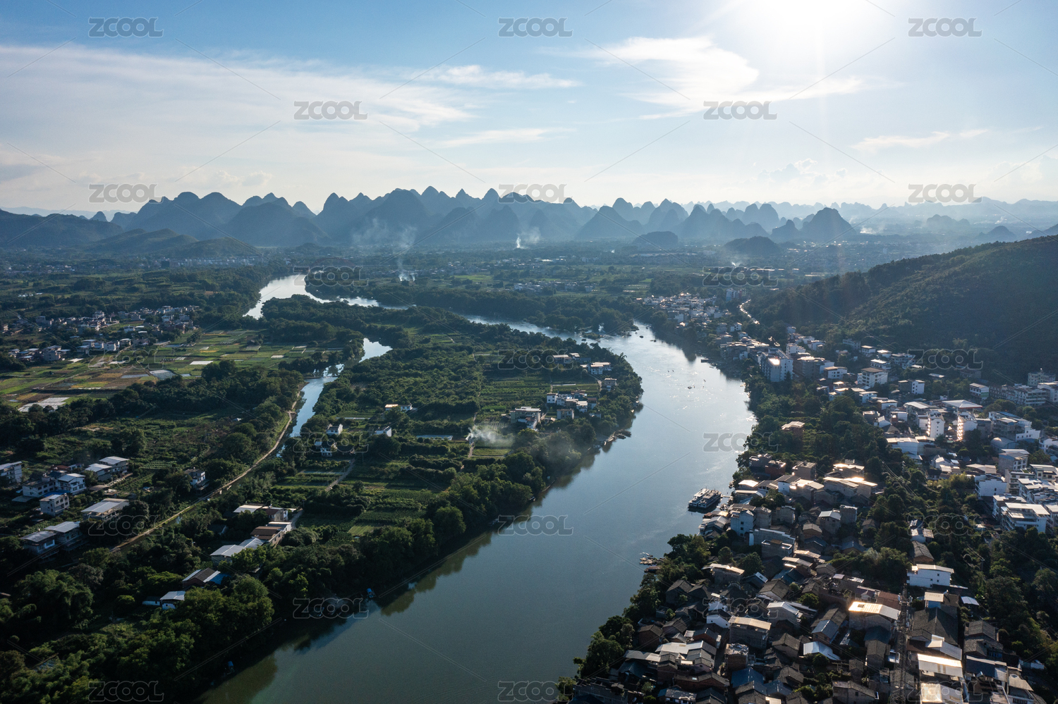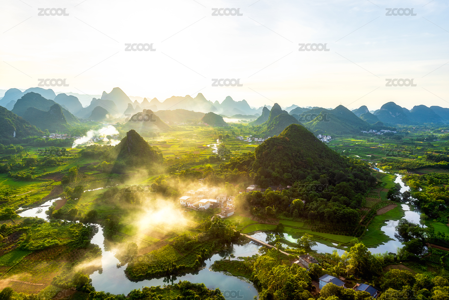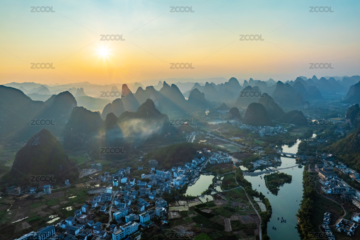 中国广西桂林阳朔葡萄镇翠屏村的日落丁达尔景观