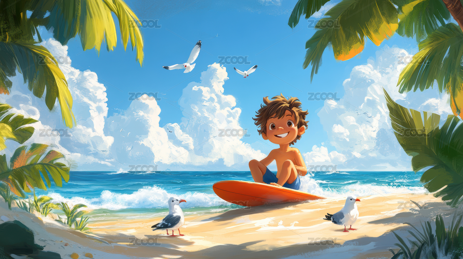 男孩,冲浪,海滩,海鸥,海浪,棕榈树,阳光,夏天,度假,冒险