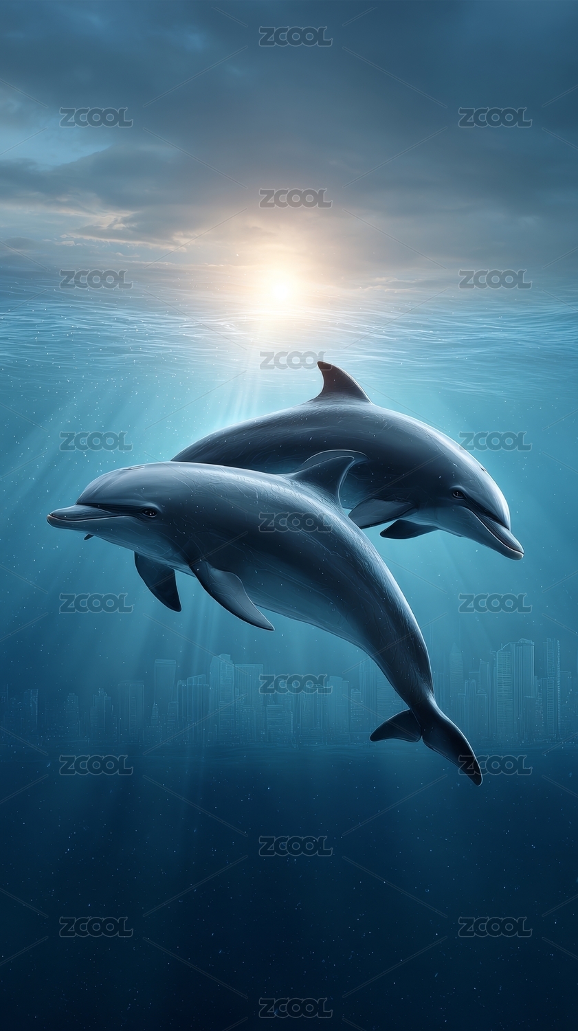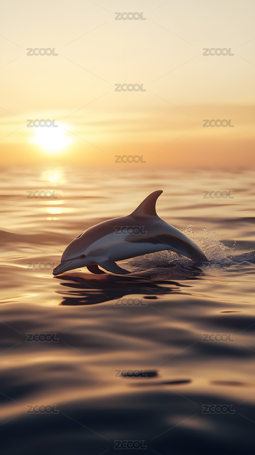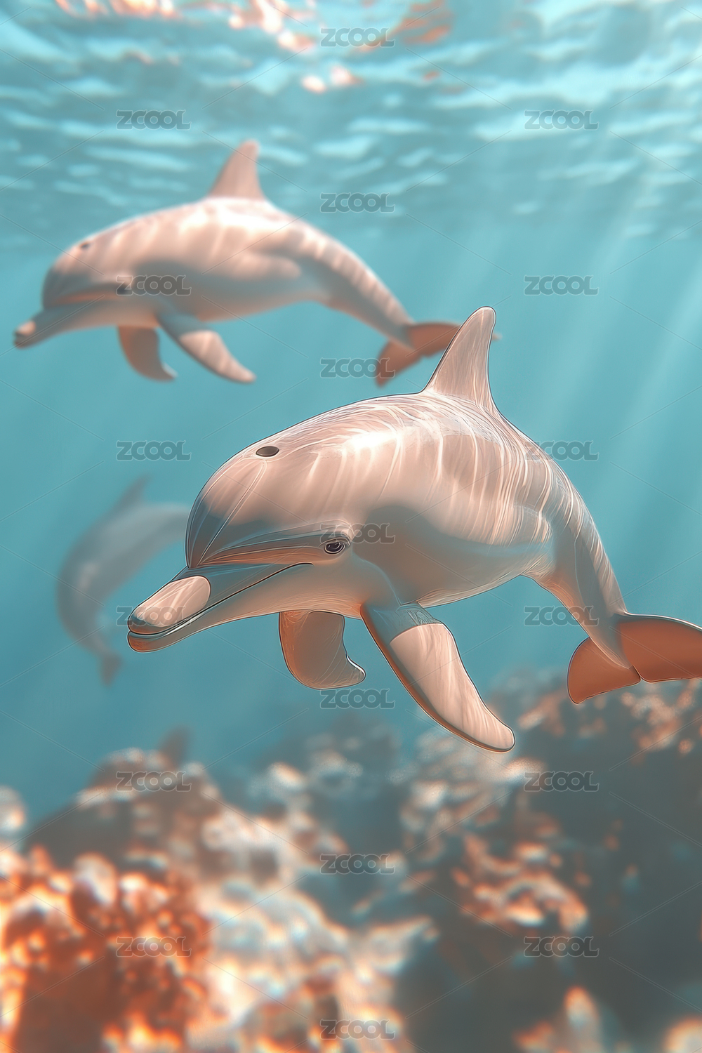 夏天度假海豚跳跃夏季海边唯美治愈3D插画