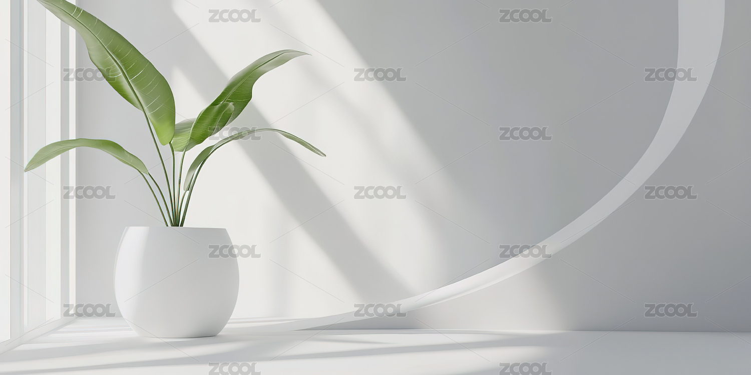 植物,绿叶,白色花盆,大理石基座,蓝色背景,光影效果,室内设计,现代风格,自然元素,清新