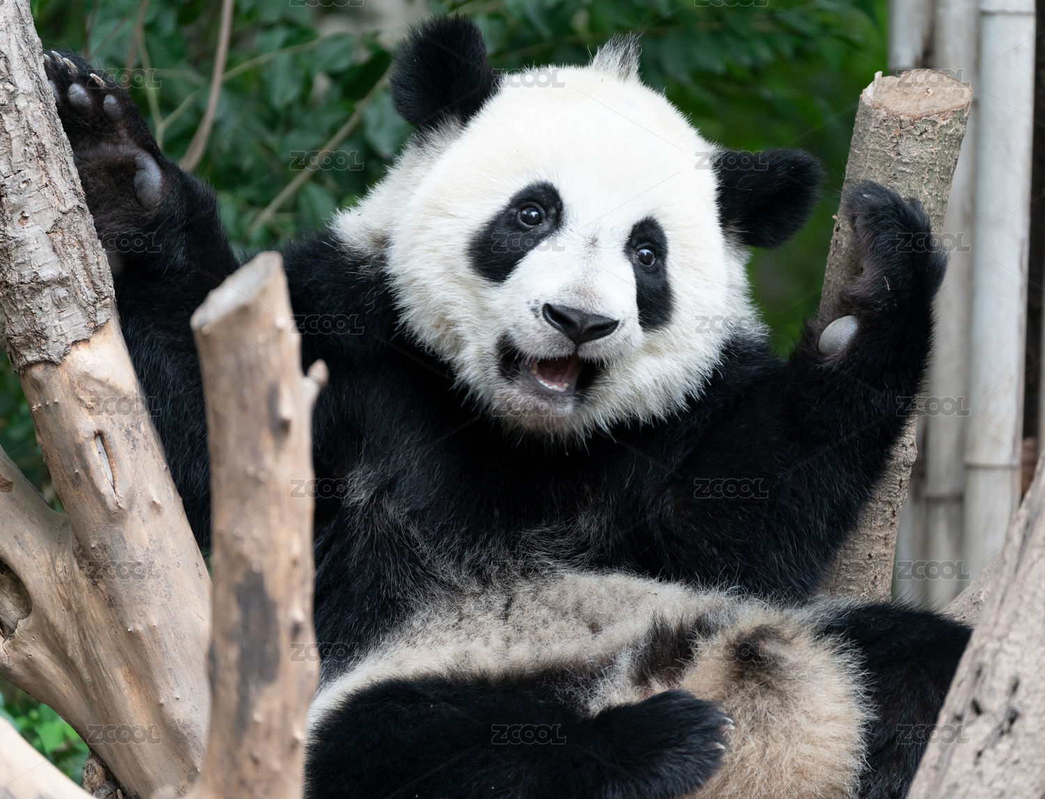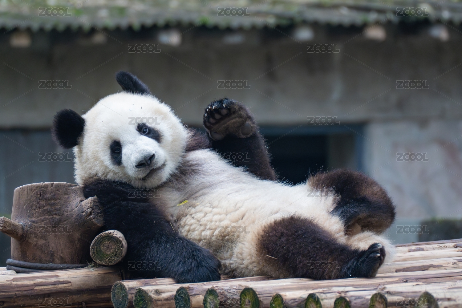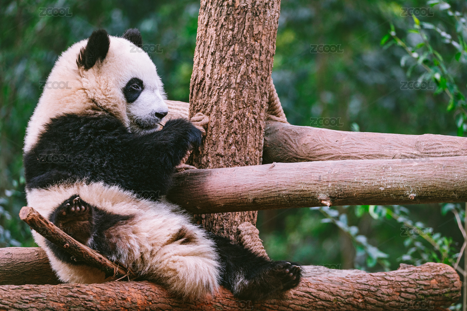 中国四川熊猫谷夏季坐躺在原木上的大熊猫
