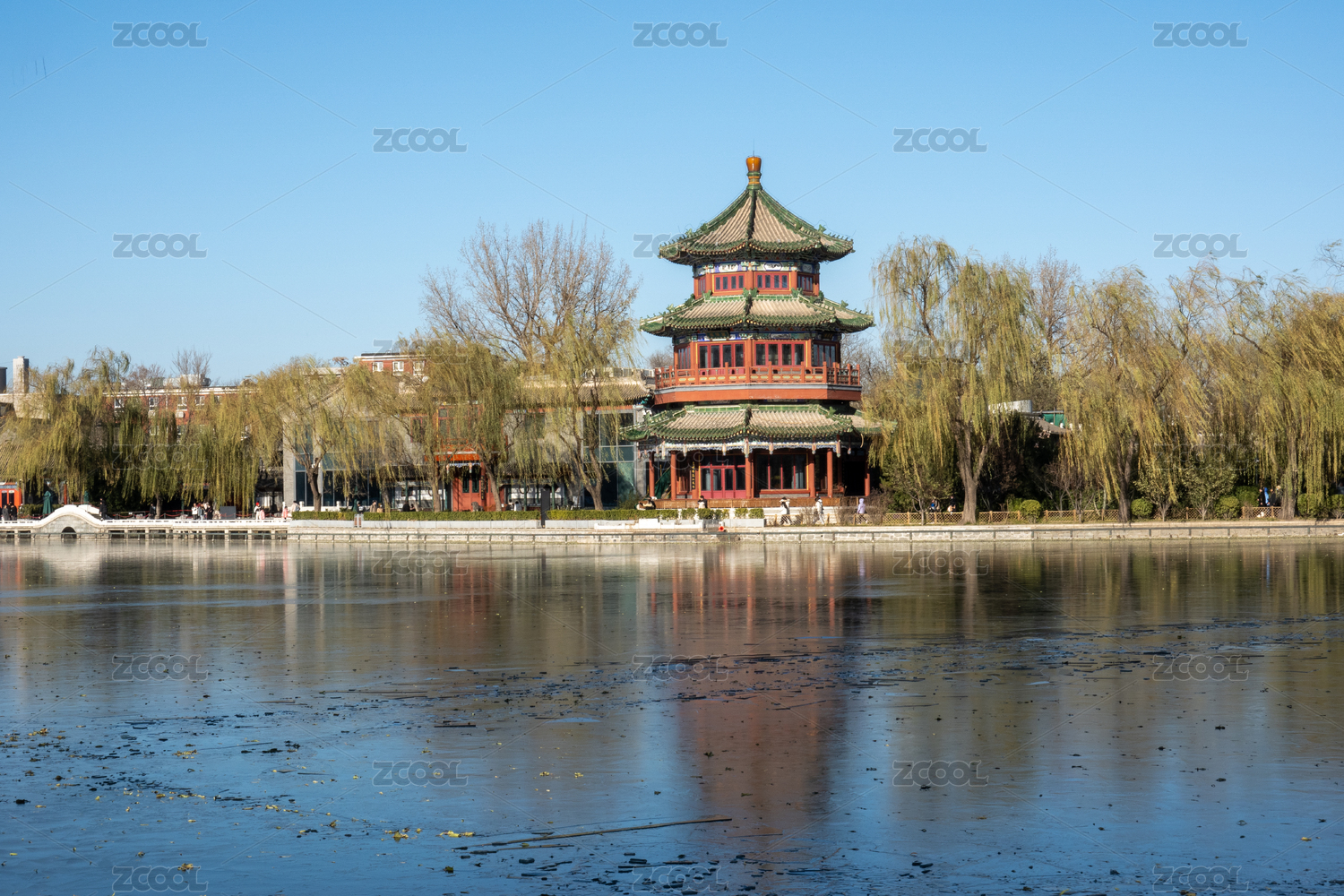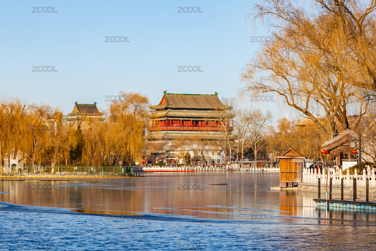 初冬时节碧空映衬下的北京什刹海后海景区风