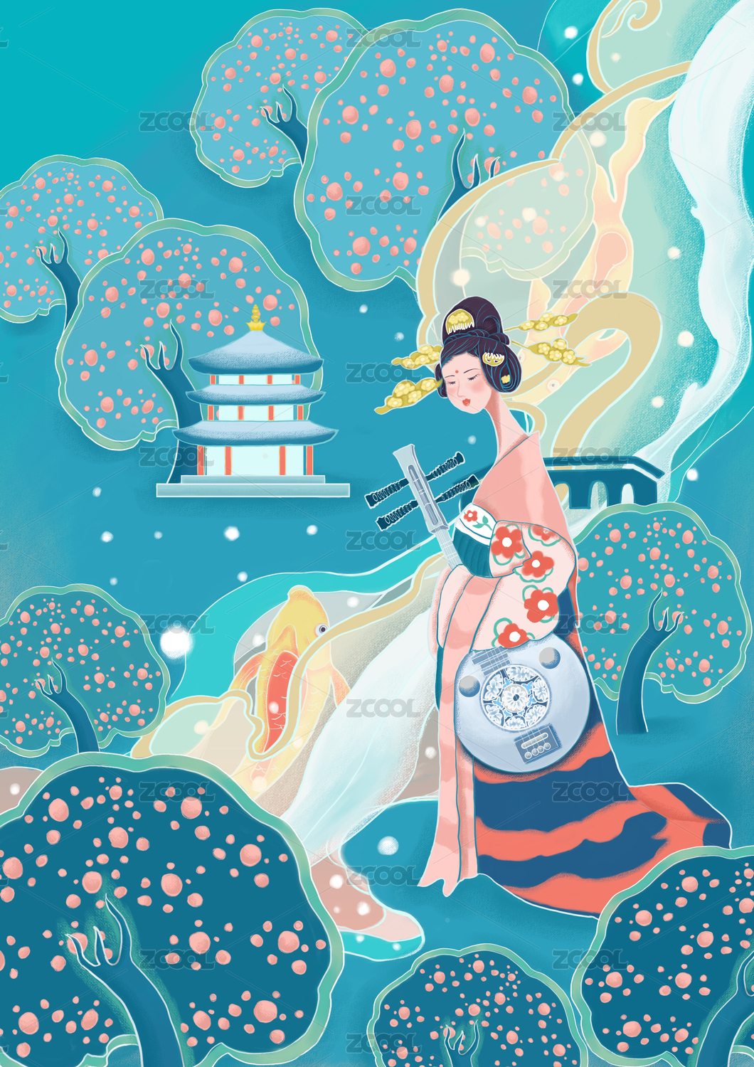 河边怀抱乐器的唐朝美女和锦鲤国风插画