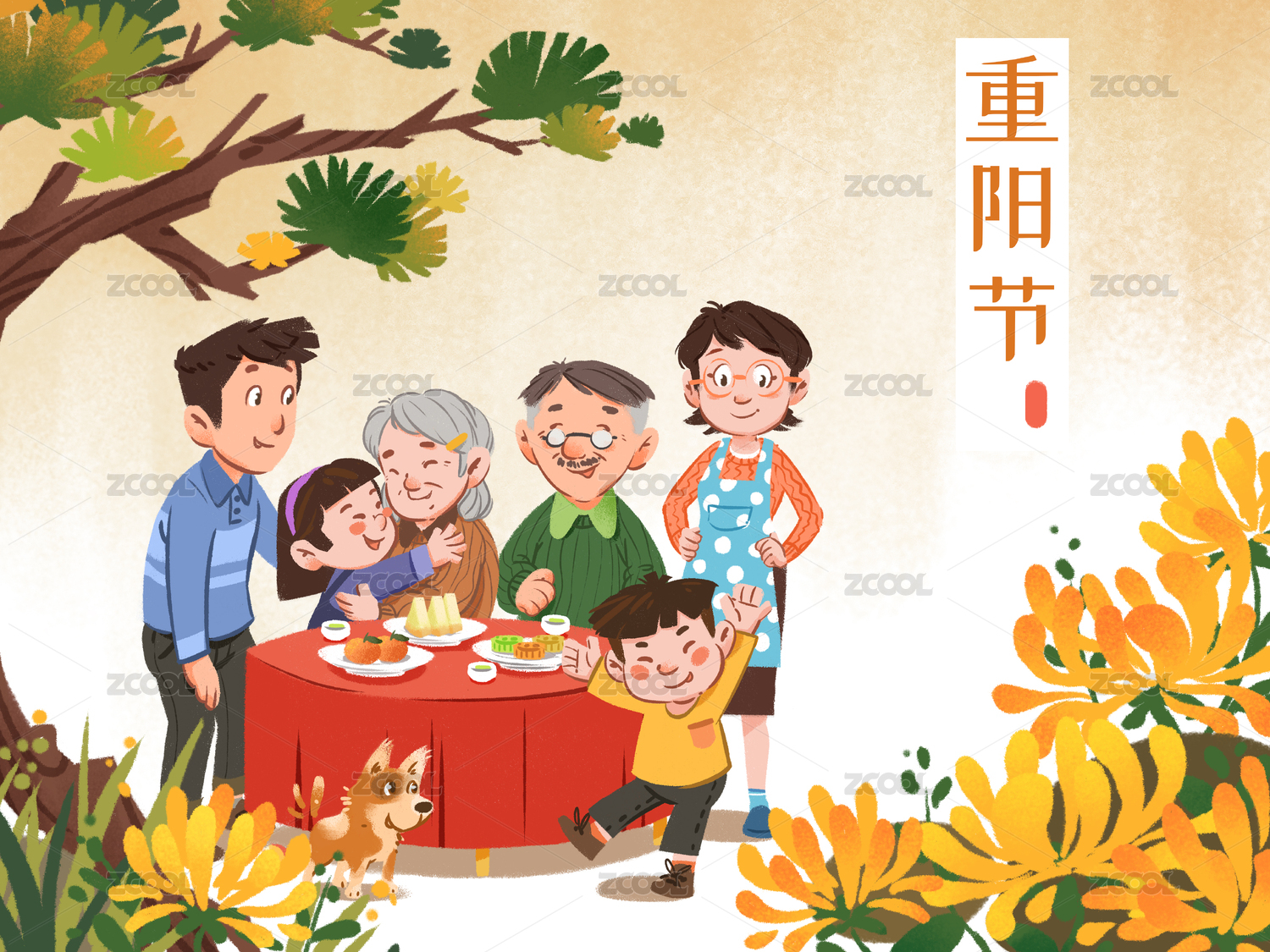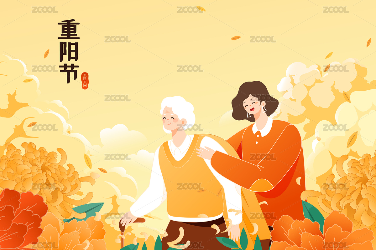 重阳节老年夫妻登高望远登山赏菊节日插画