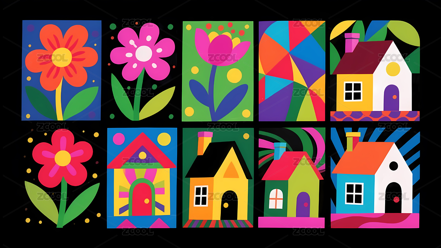 彩色方块中的花与房屋