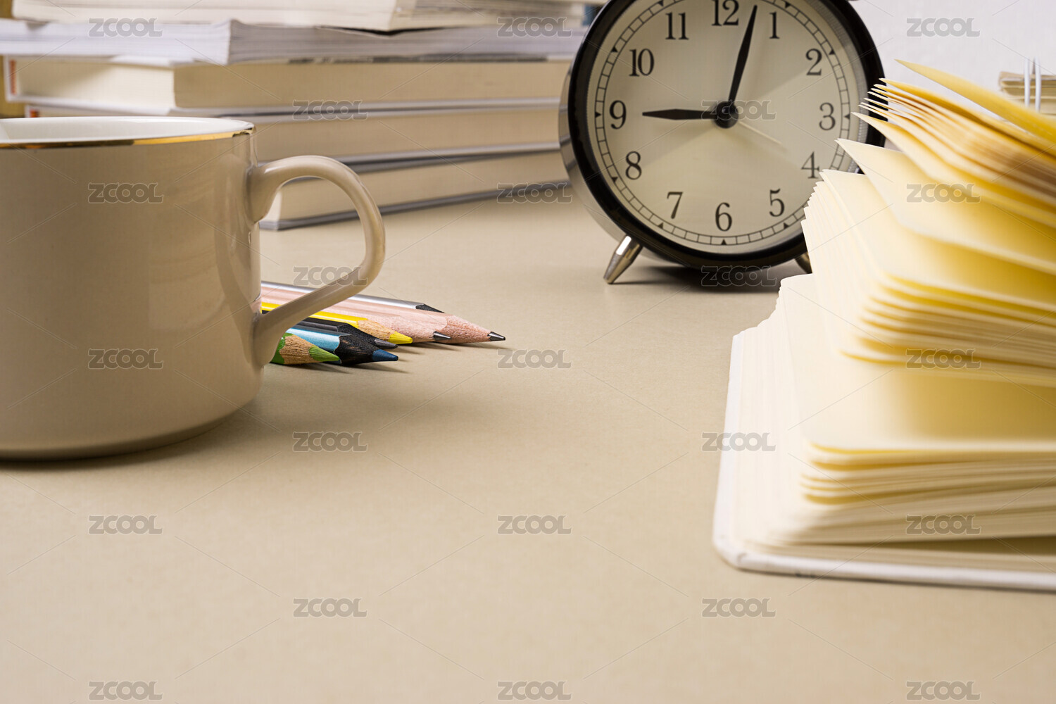 办公桌面上的书籍闹钟与笔筒