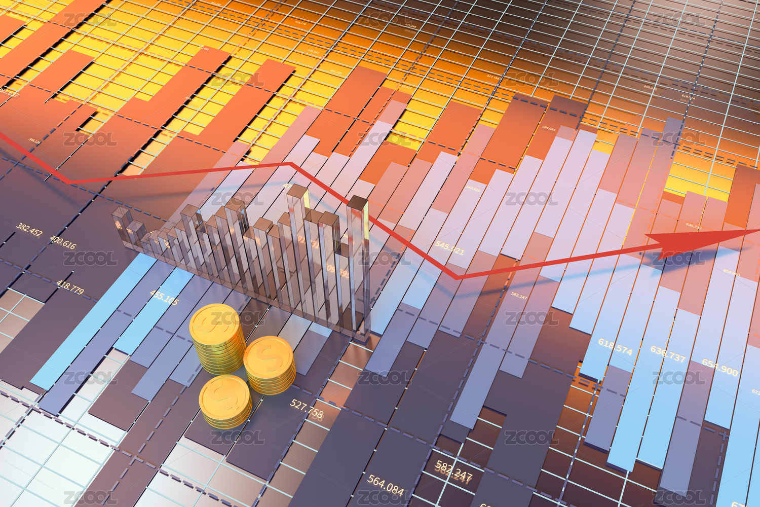 金融成功箭头与饼状图,货币符号