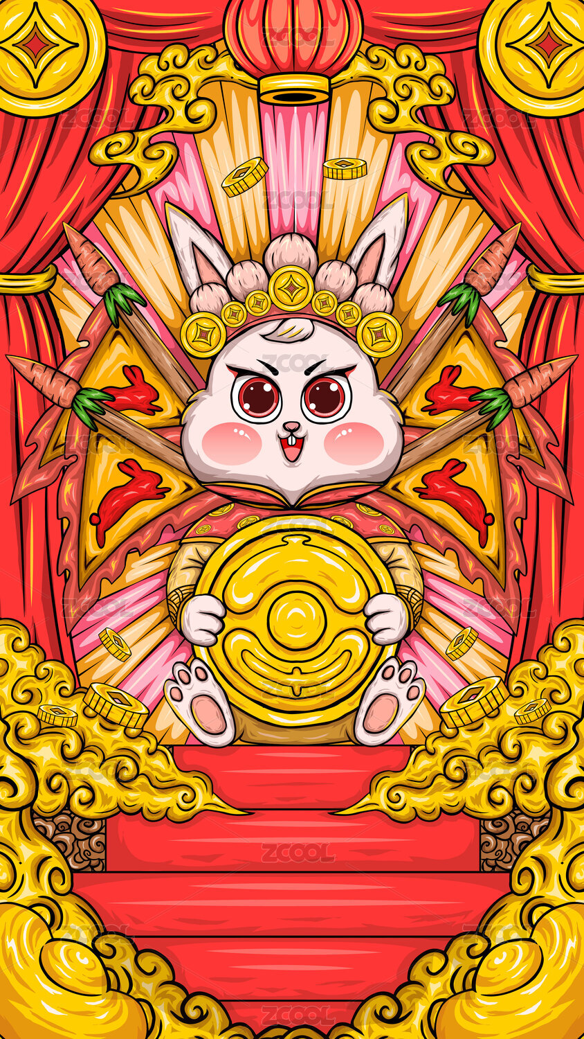 兔年恭喜发财招财进宝卯兔新年国潮插画