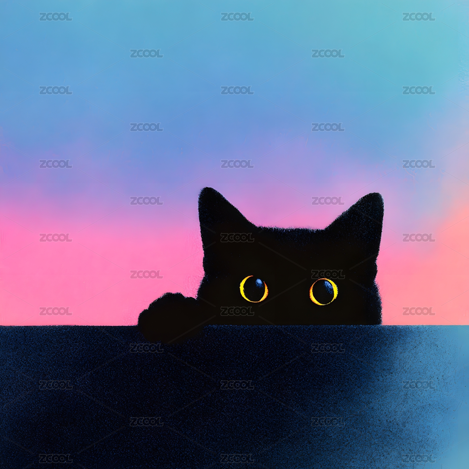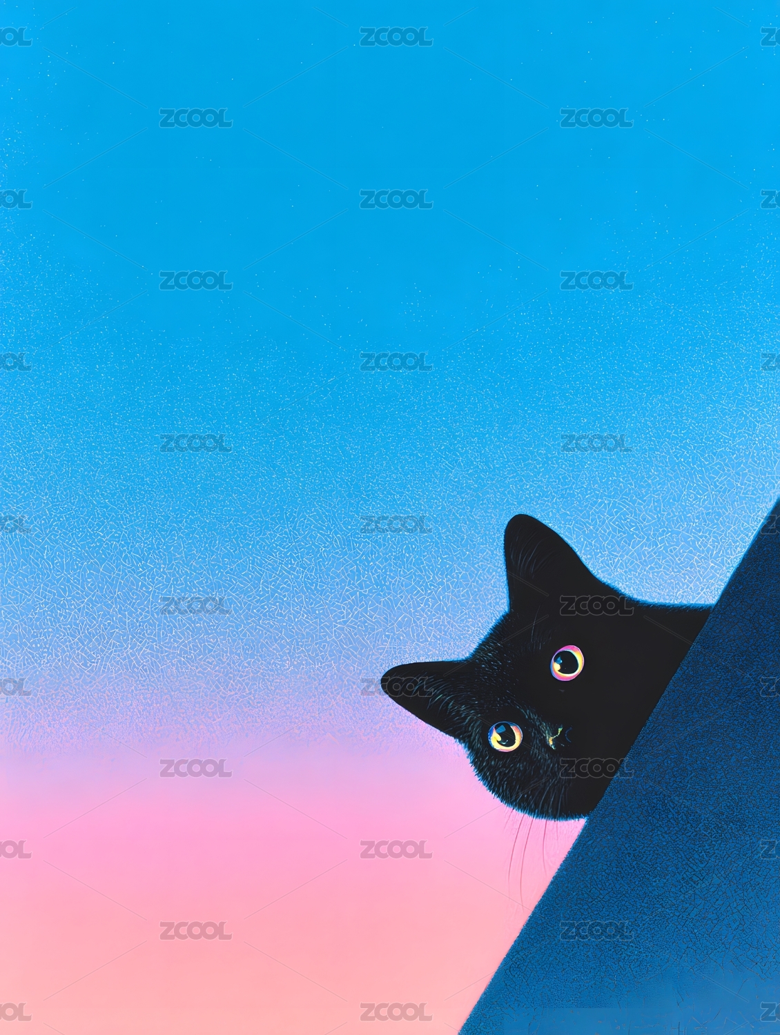 黑猫探出头于粉蓝渐变背景