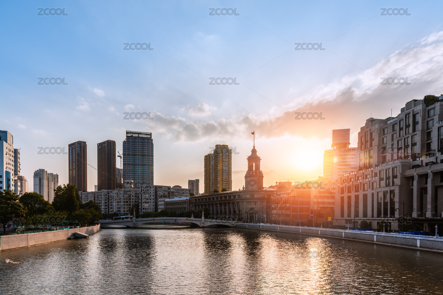 夕阳下的上海苏州河沿岸