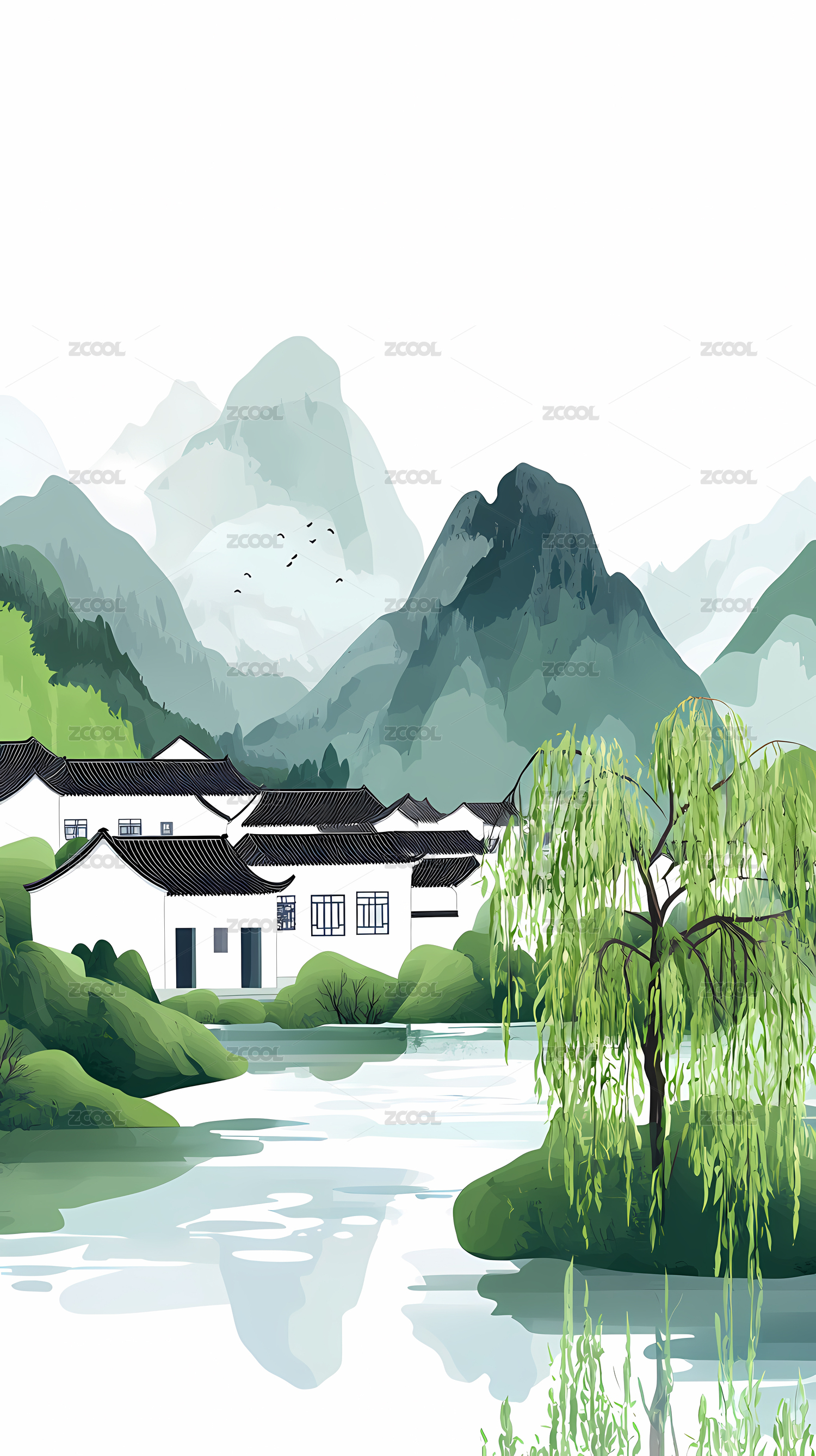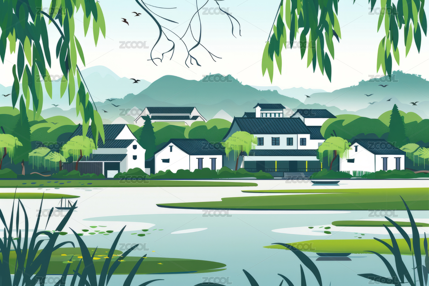 江南,乡村,春天,山水,插画,建筑,风景,房屋,中国风,节气