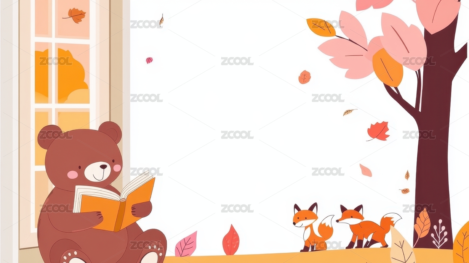 秋日窗边阅读的可爱小动物们