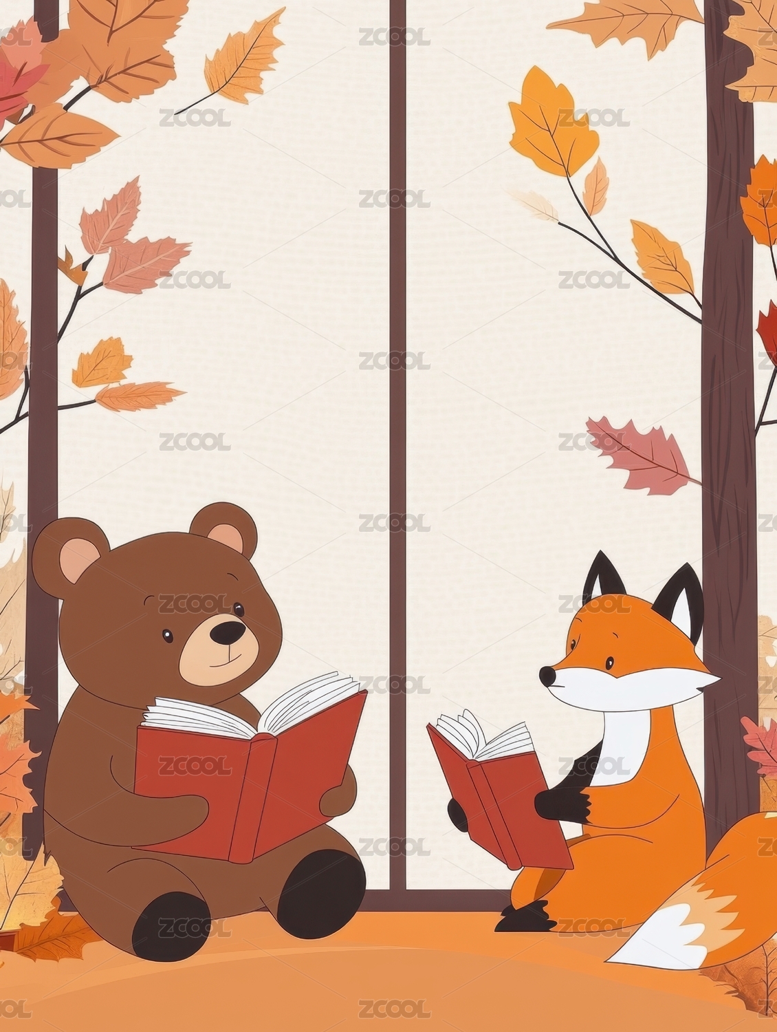 秋季森林里读书的熊和小鹿