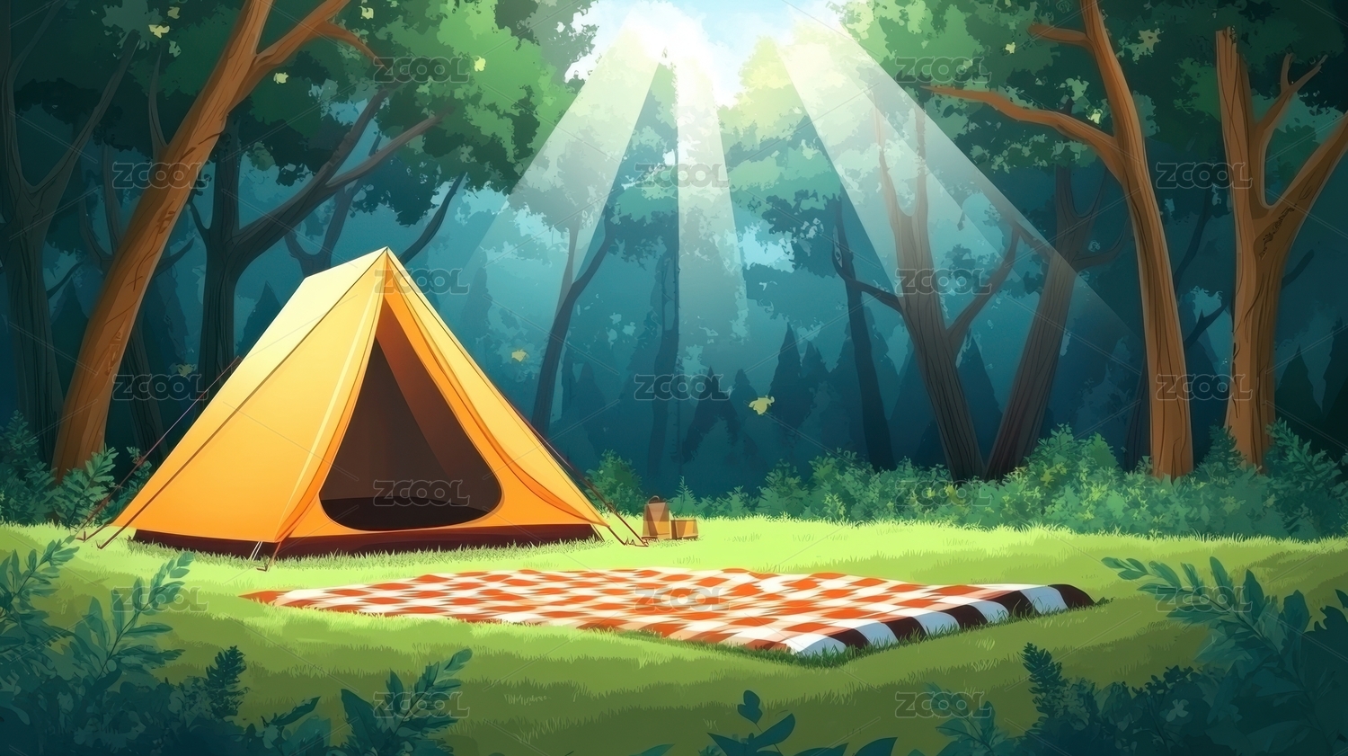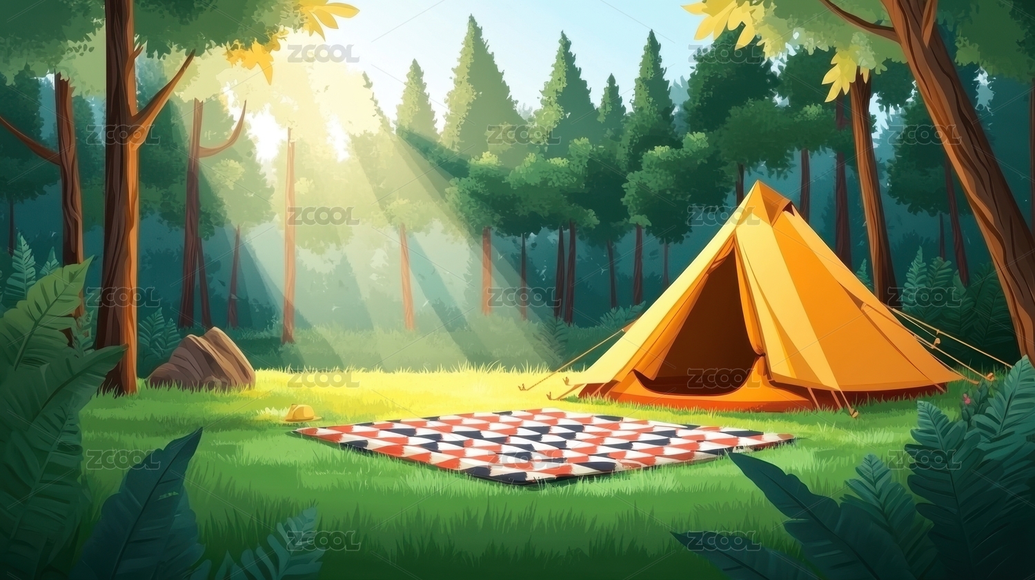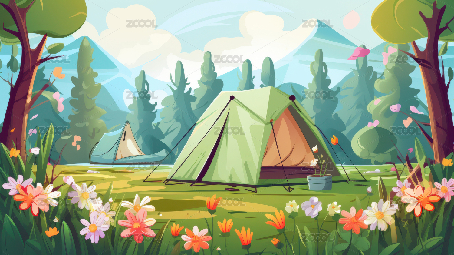 田园露营帐篷卡通插画