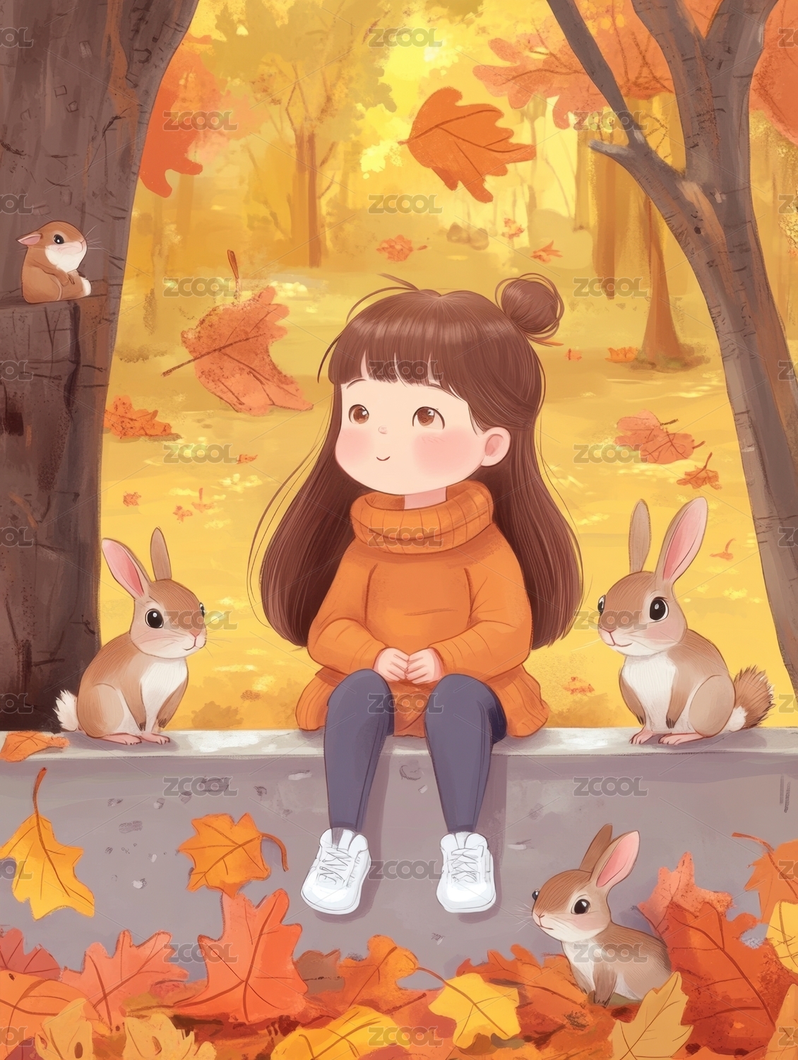 秋天森林中的女孩和兔子插画