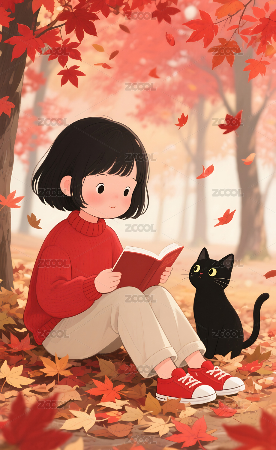治愈系手绘插画秋日红叶下小女孩看书插画