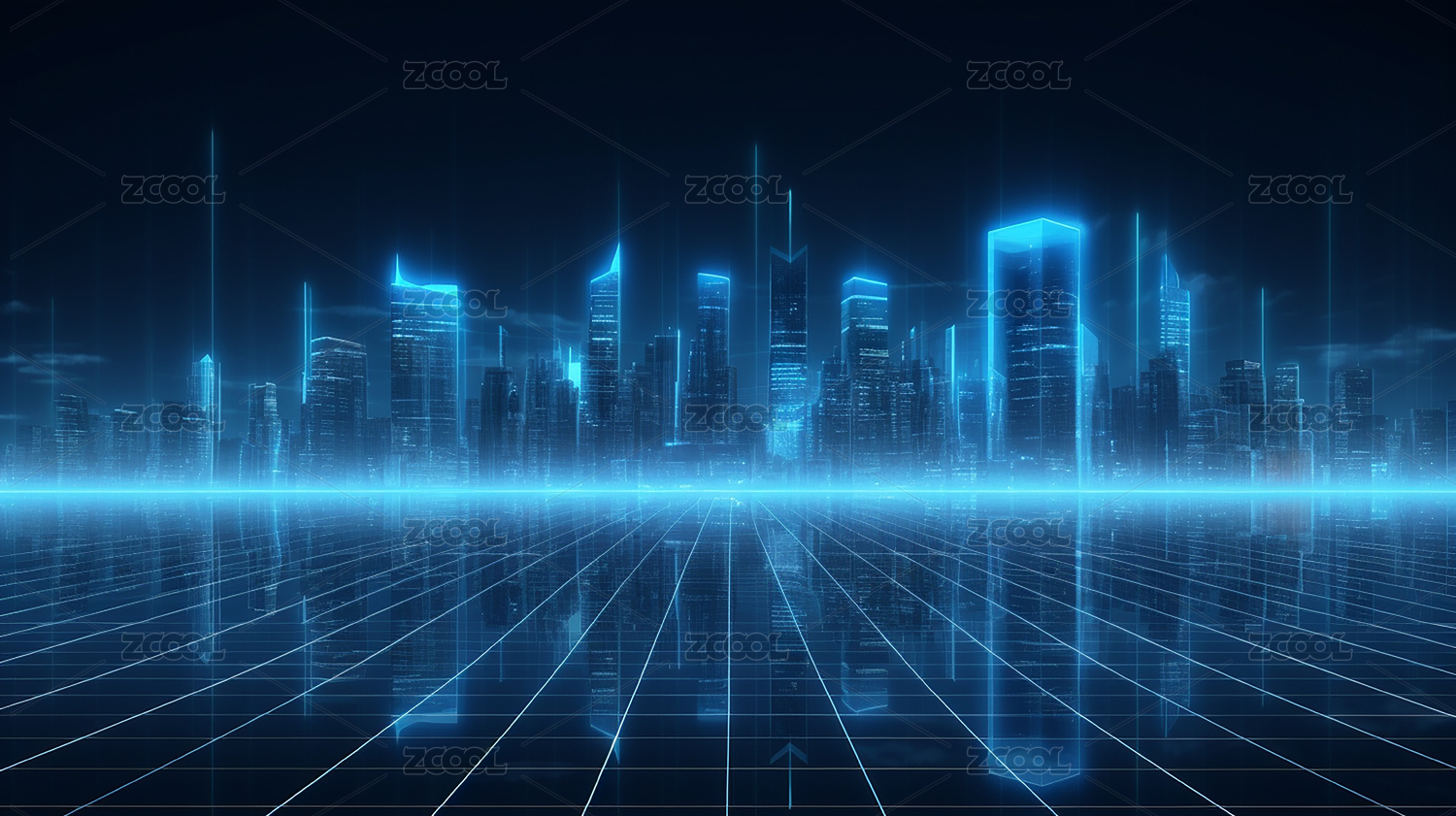 蓝色网格线前景的城市天际线