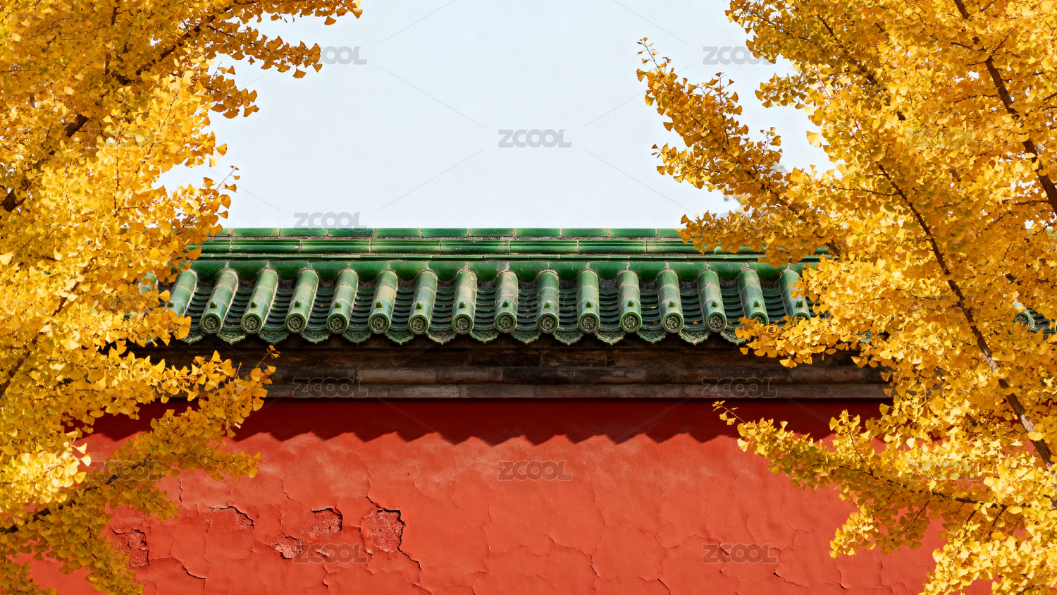 中国北京秋天银杏掩映下的宫墙屋檐