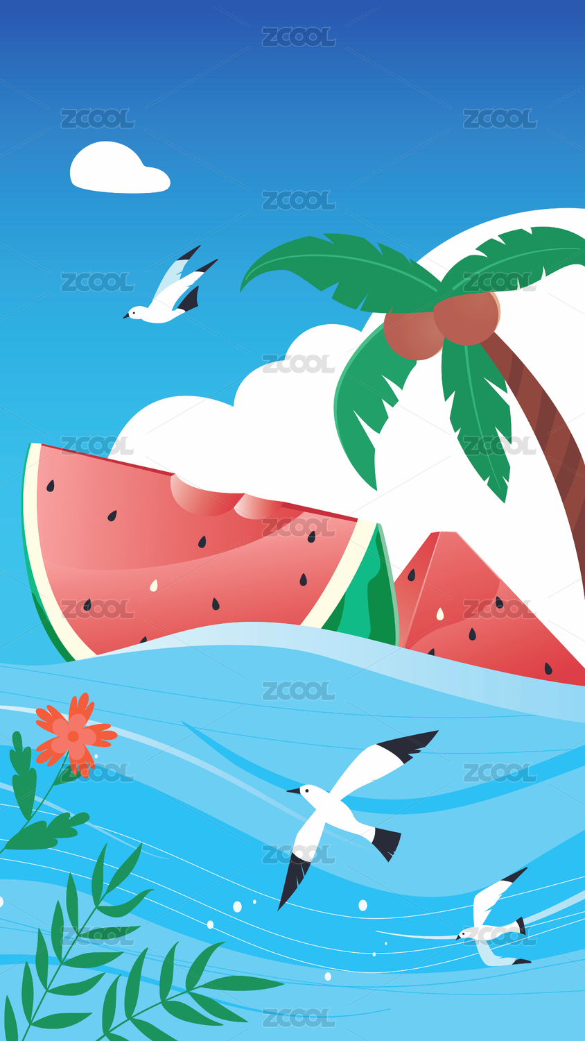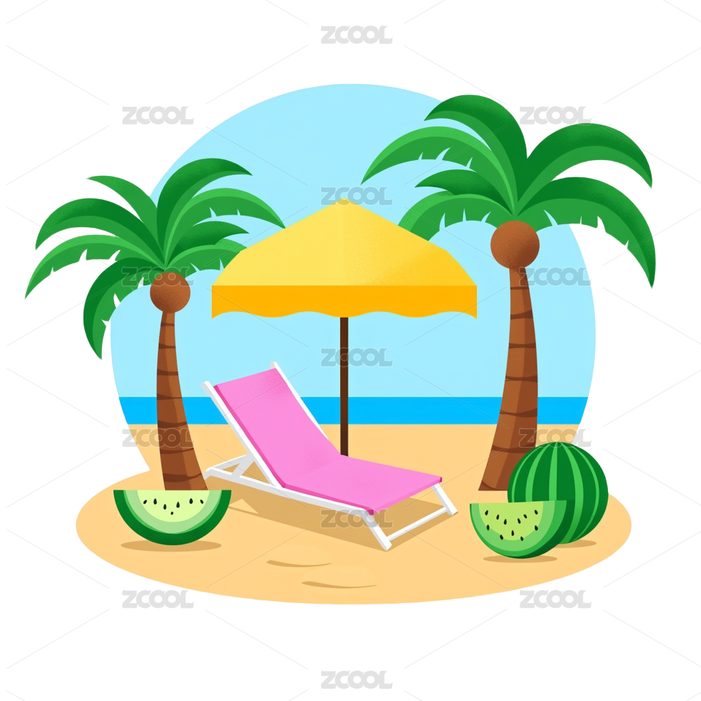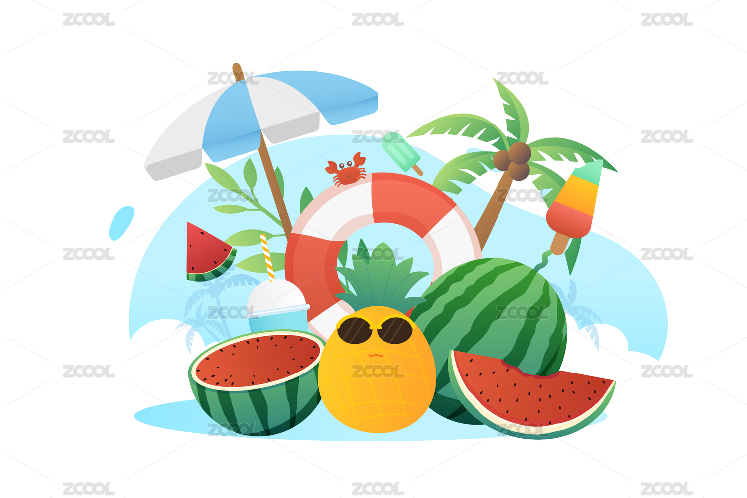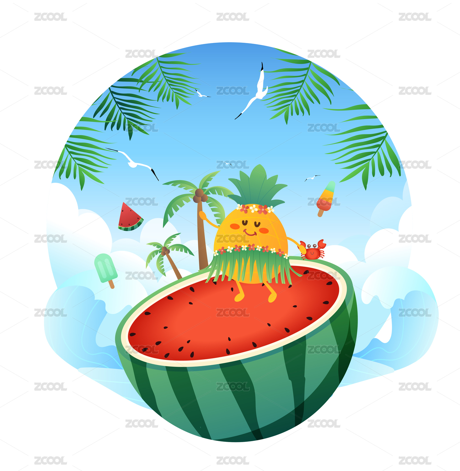 夏天大海清凉西瓜菠萝矢量插画