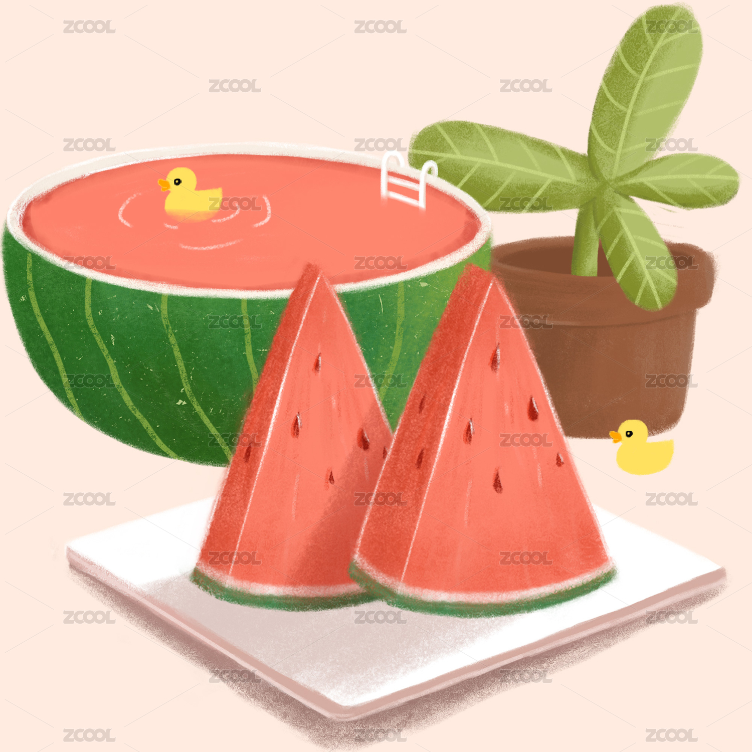 可爱小黄鸭夏天西瓜插画素材