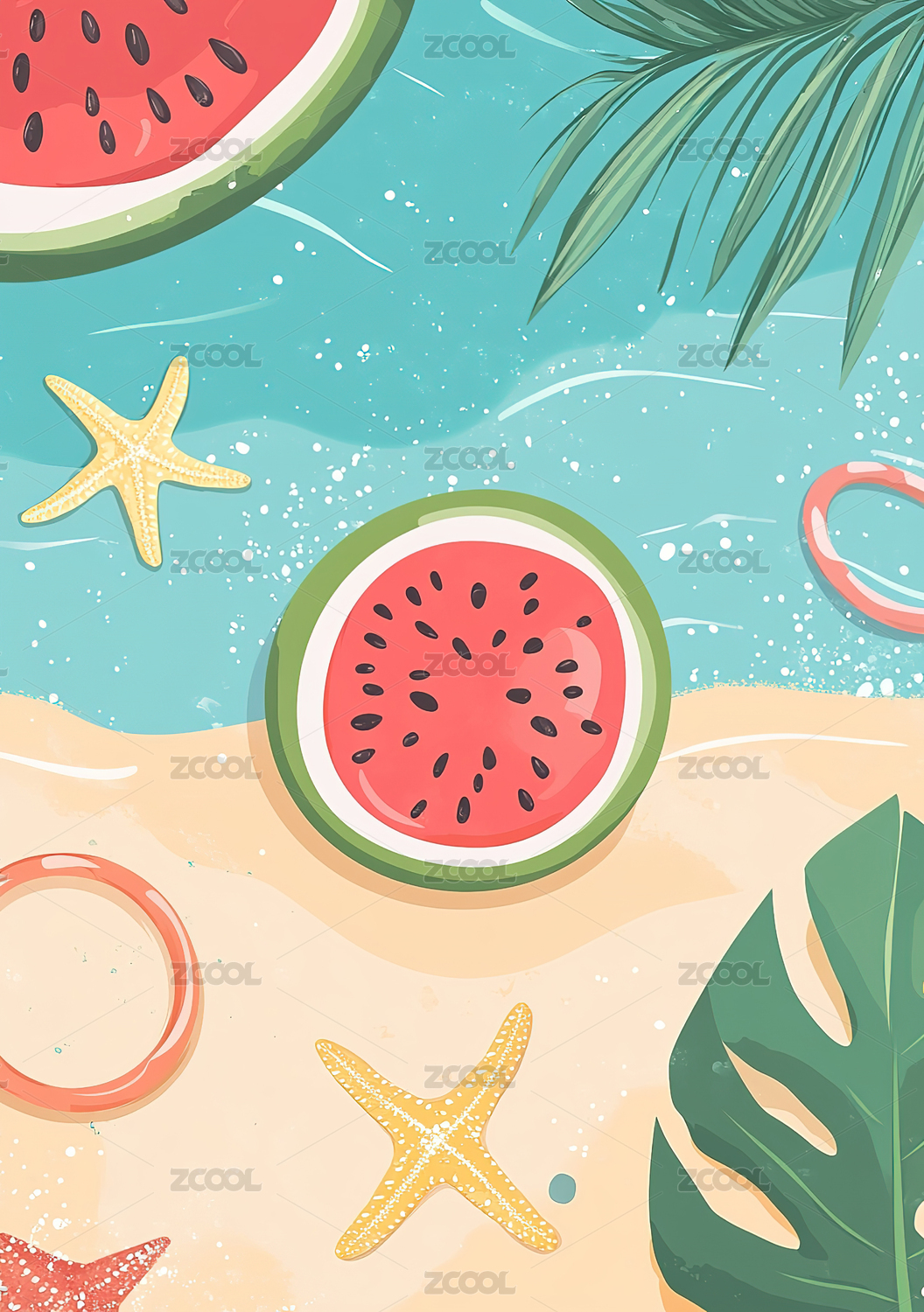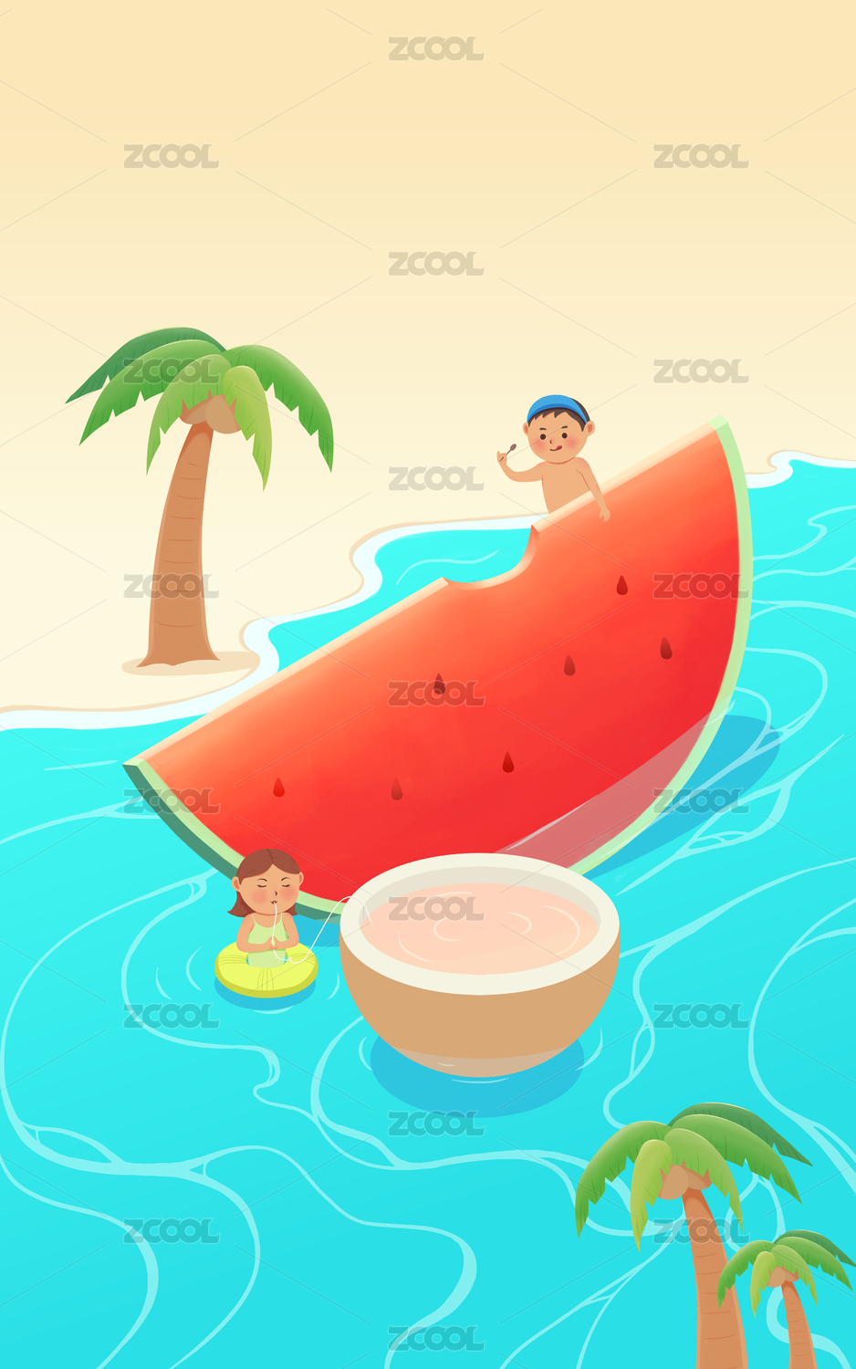 夏天海边西瓜椰树上传泳装的男生女生