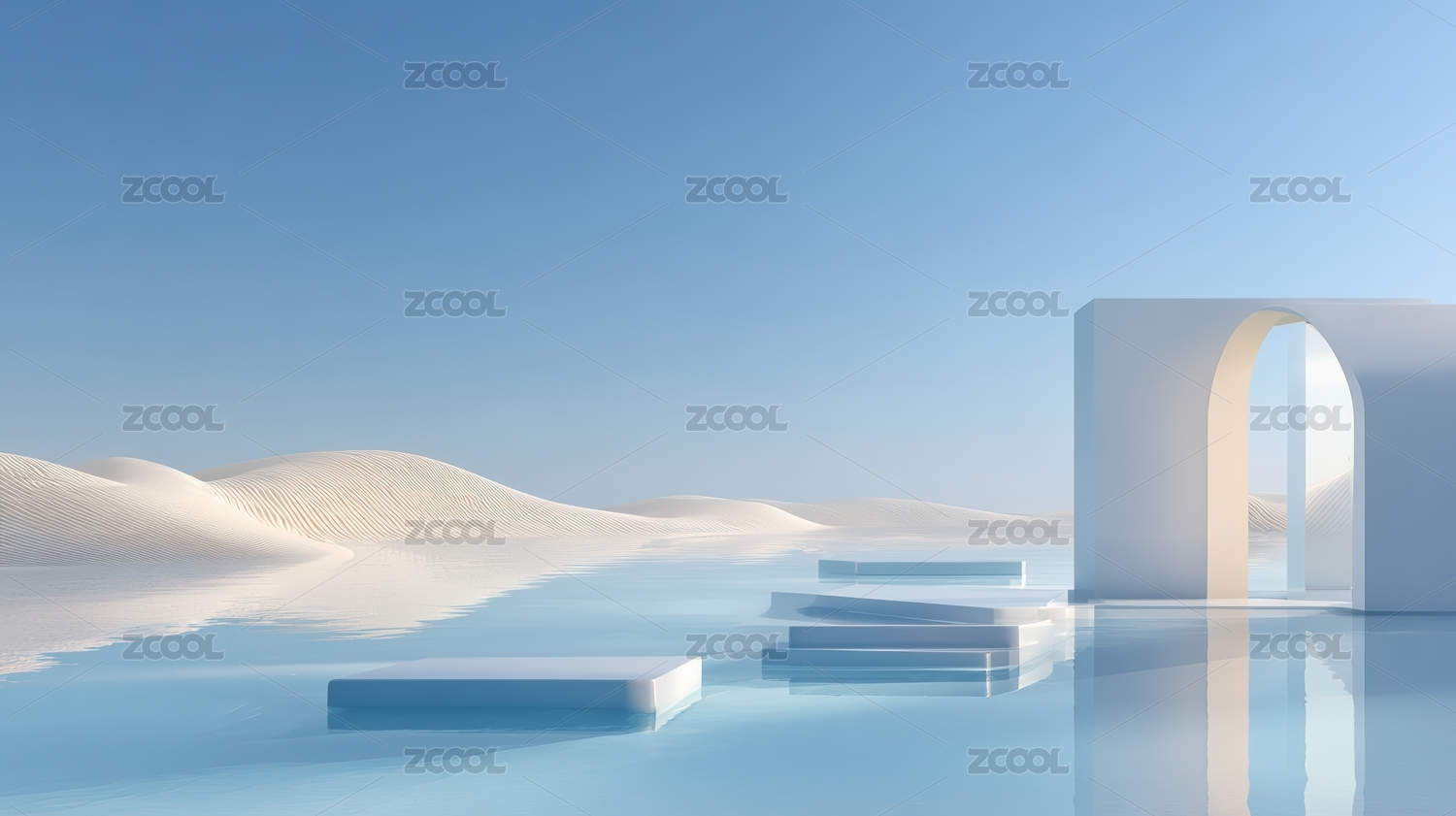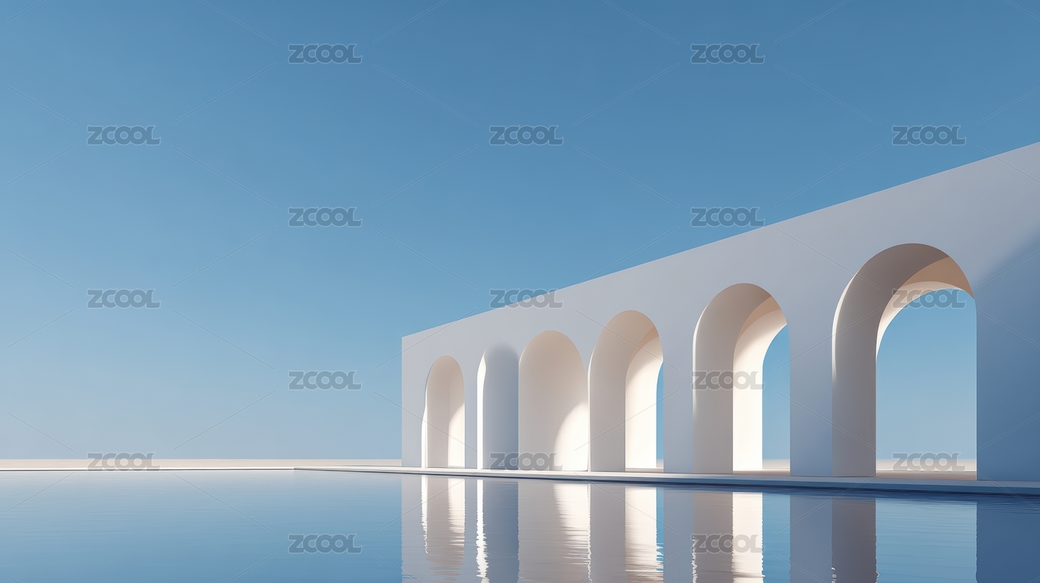 白色拱门建筑倒映水面