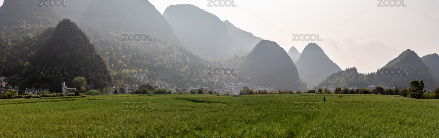 贵州兴义万峰林清晨的村庄、山峦与农田