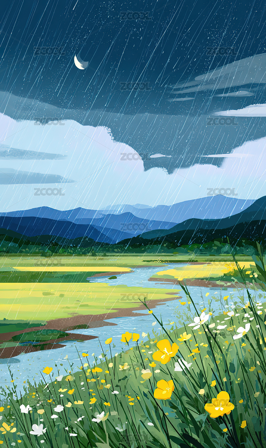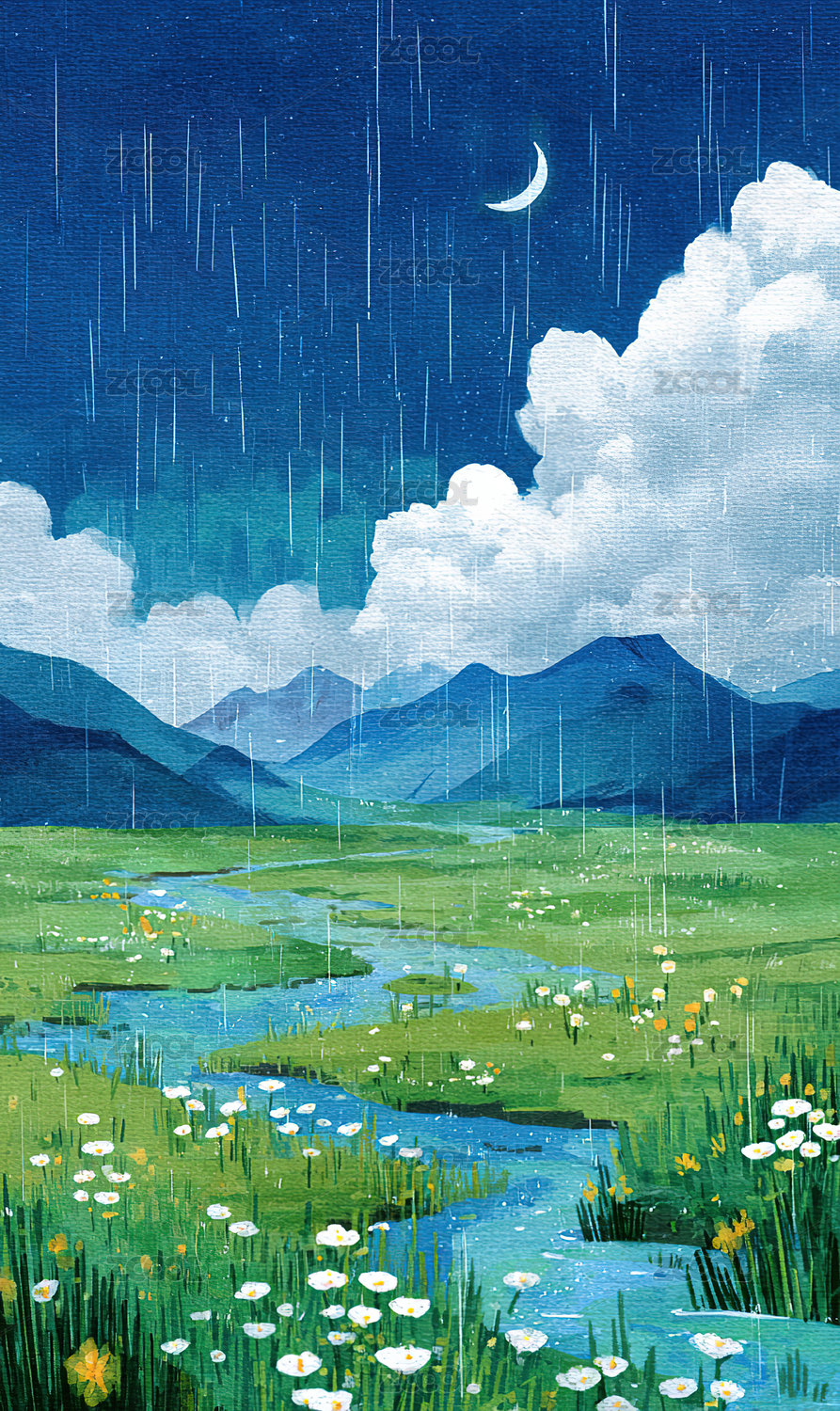 卡通手绘质感扁平峡谷水面情侣风景插画