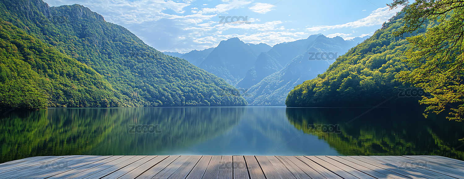 绿色山景自然风景与木质平台