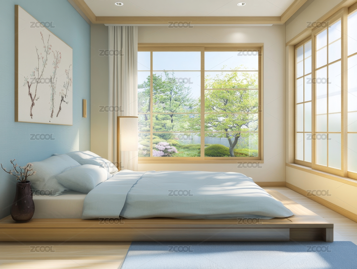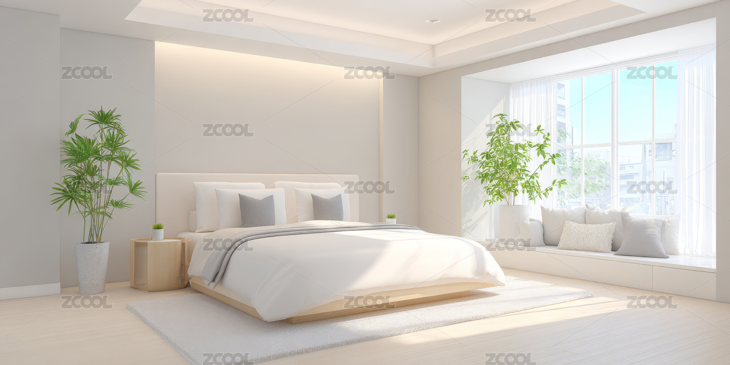 卧室,简约,绿植,自然光,床铺,木质,地板,装饰画,窗帘,室内