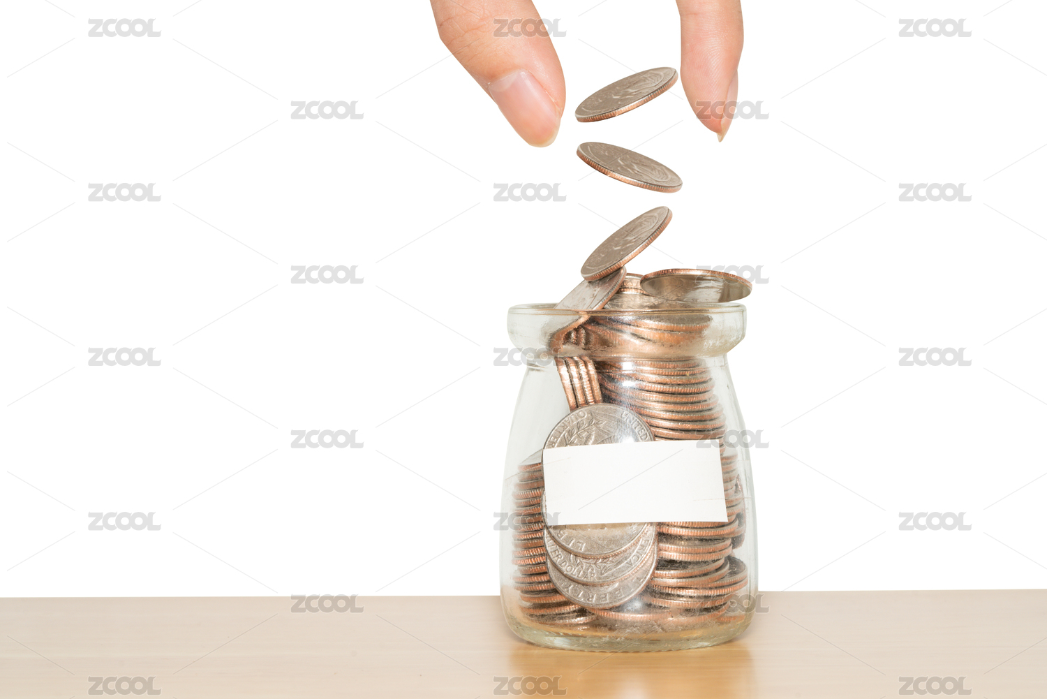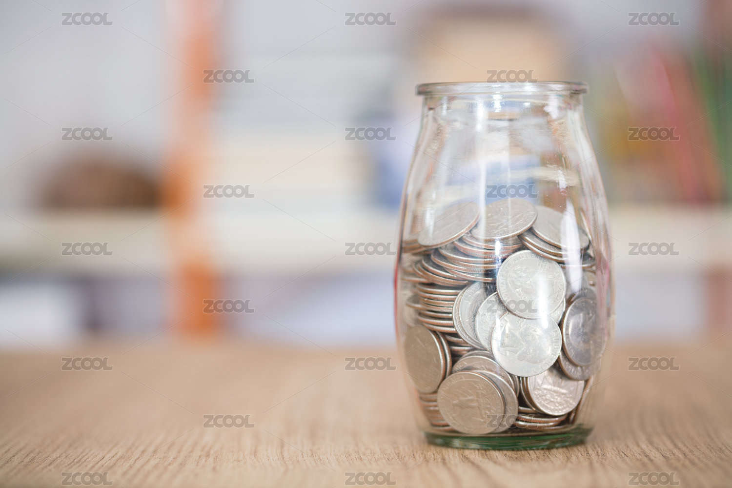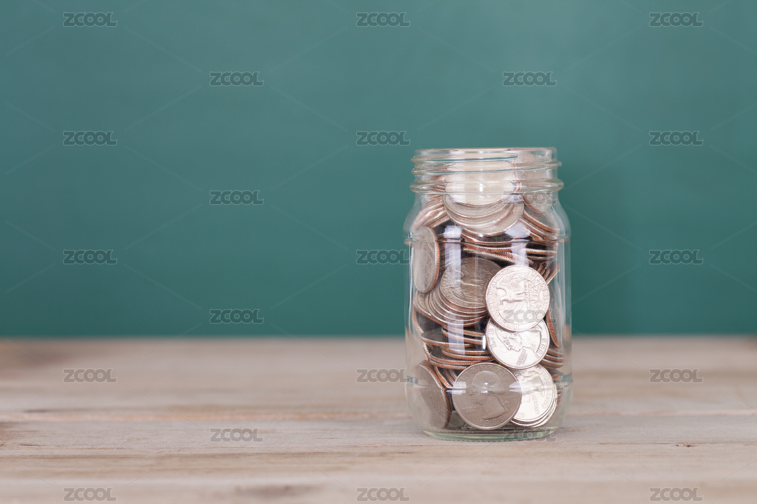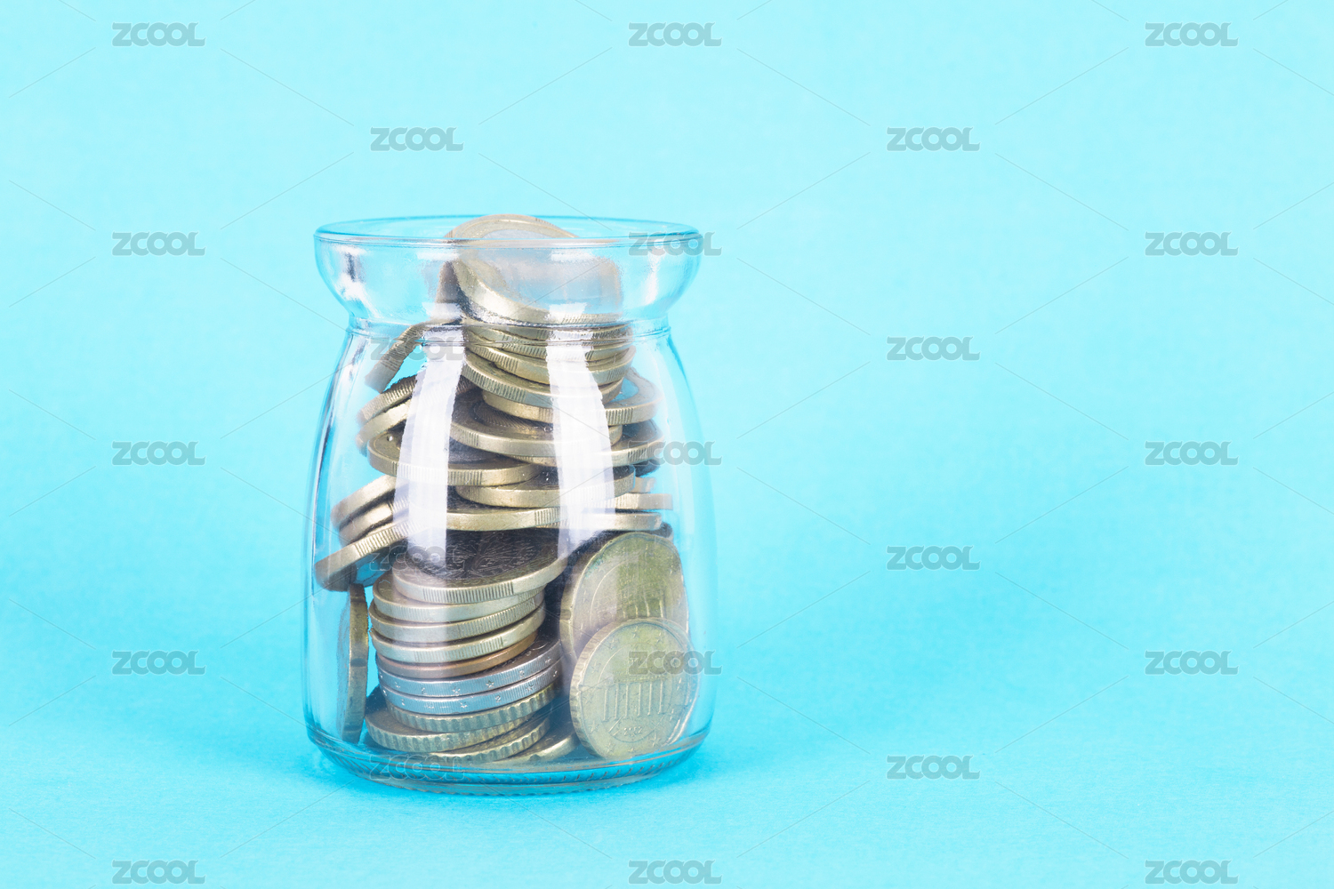储蓄概念图像。 玻璃瓶中的硬币和自然背景