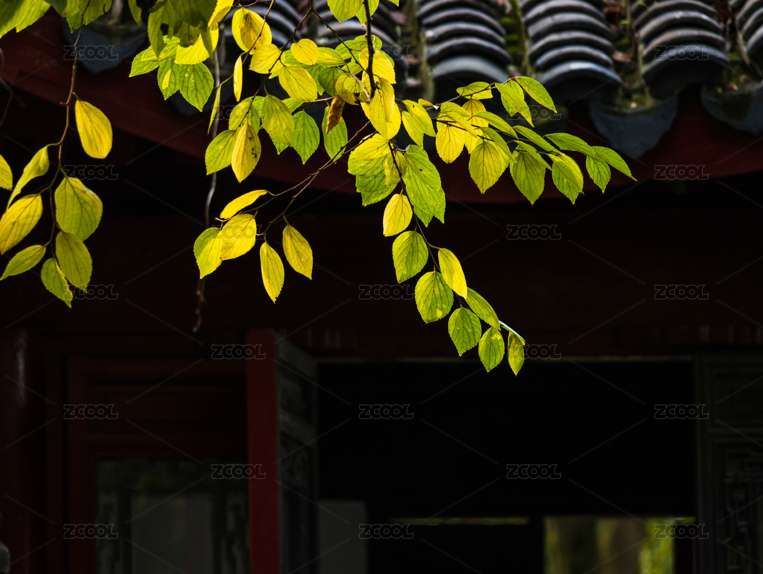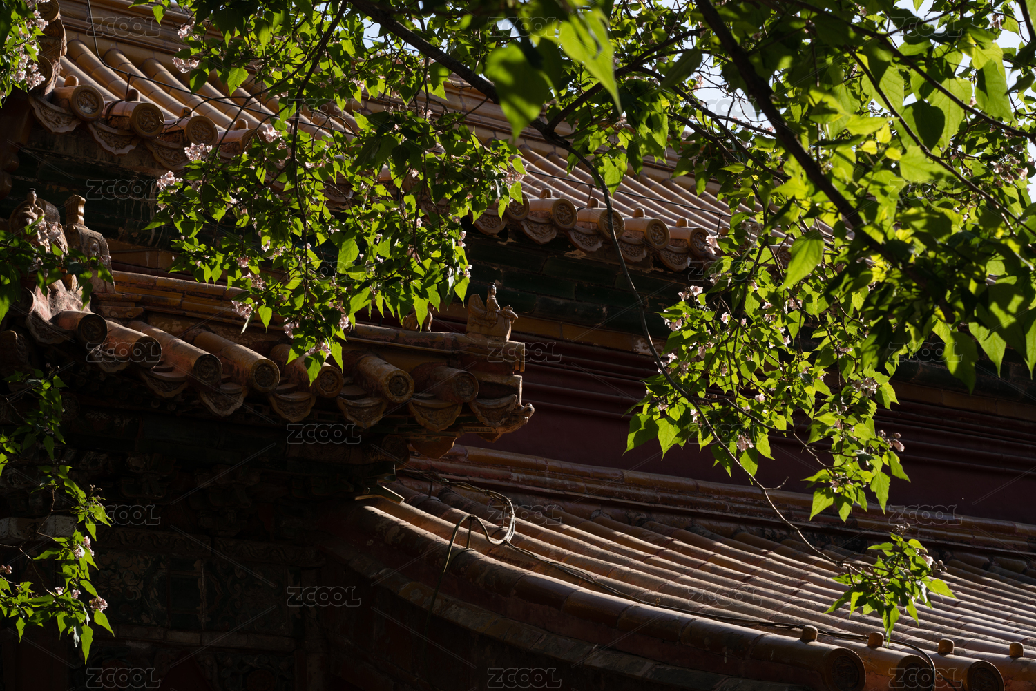 绿叶掩映下的中式瓦顶砖石