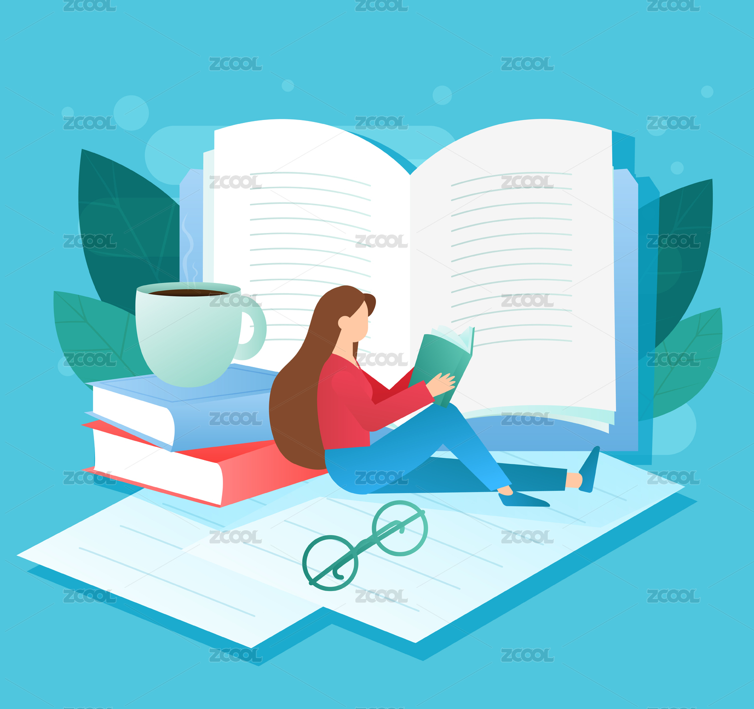男性坐着靠着一堆书手里拿着书在挑灯阅读
