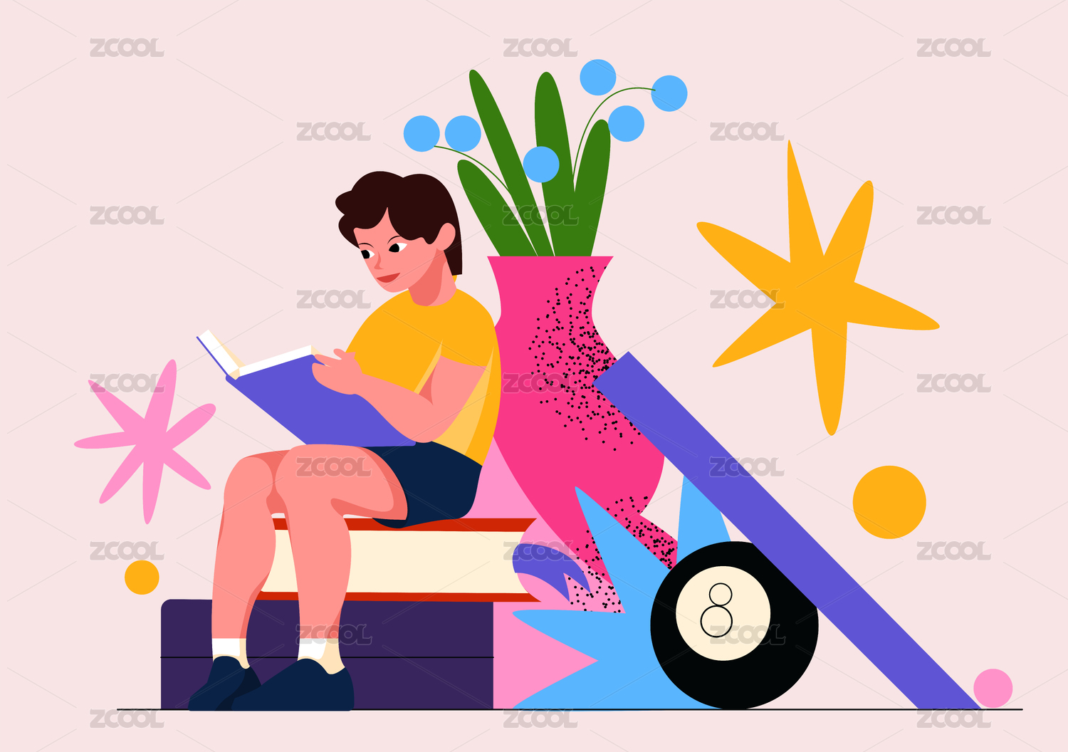 阅读书籍的男孩与猫,矢量扁平概念插画