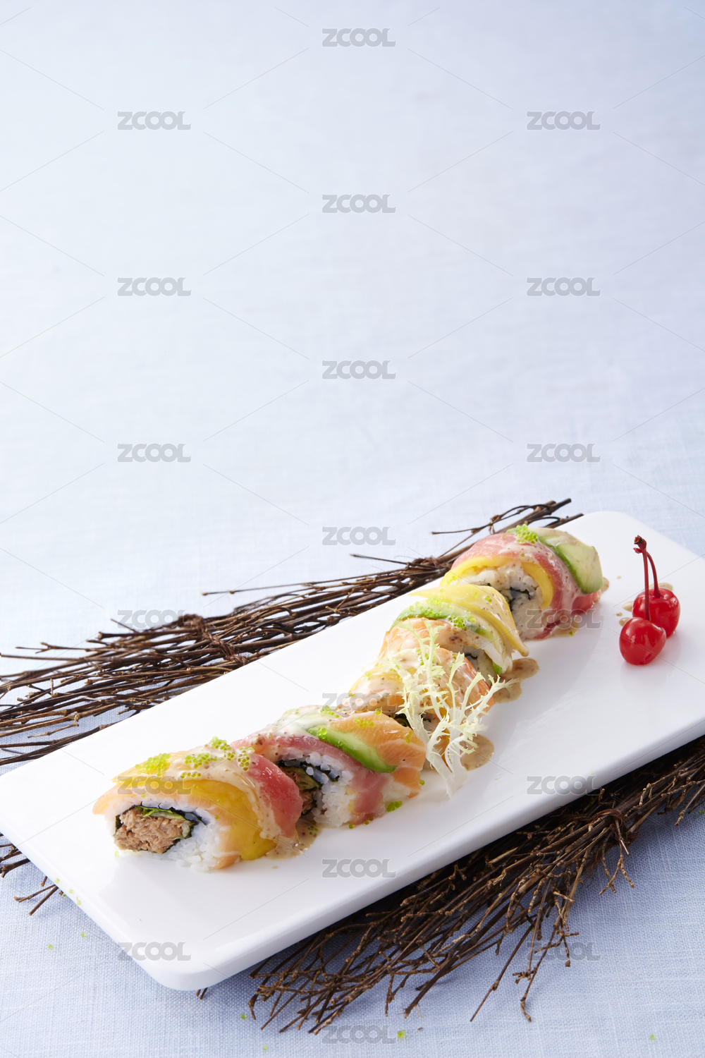 长瓷盘装的蟹子教授卷摆放在寿司帘上