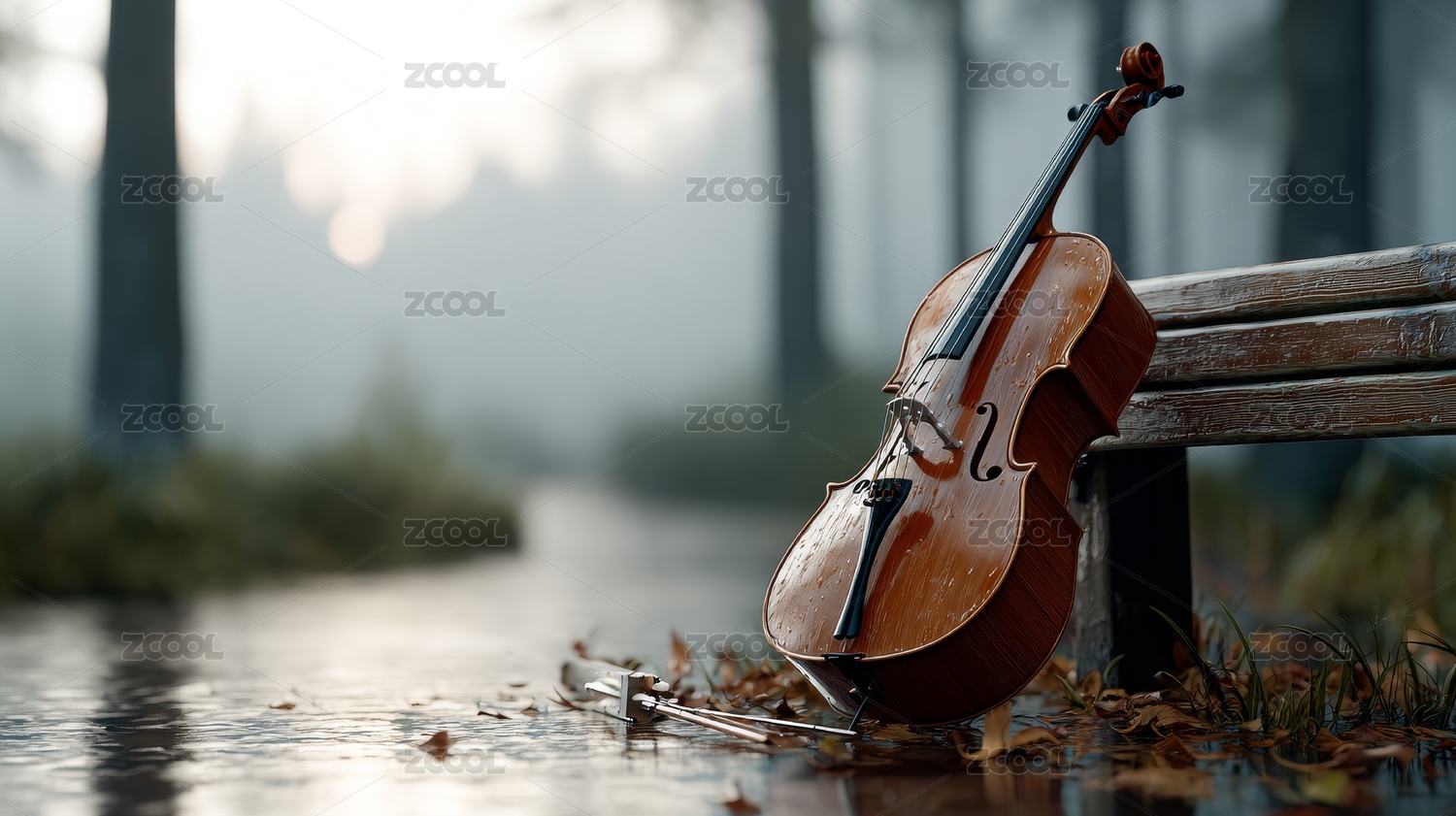 夕阳光影下草地上放置的一把小提琴一盆花和一撂书本