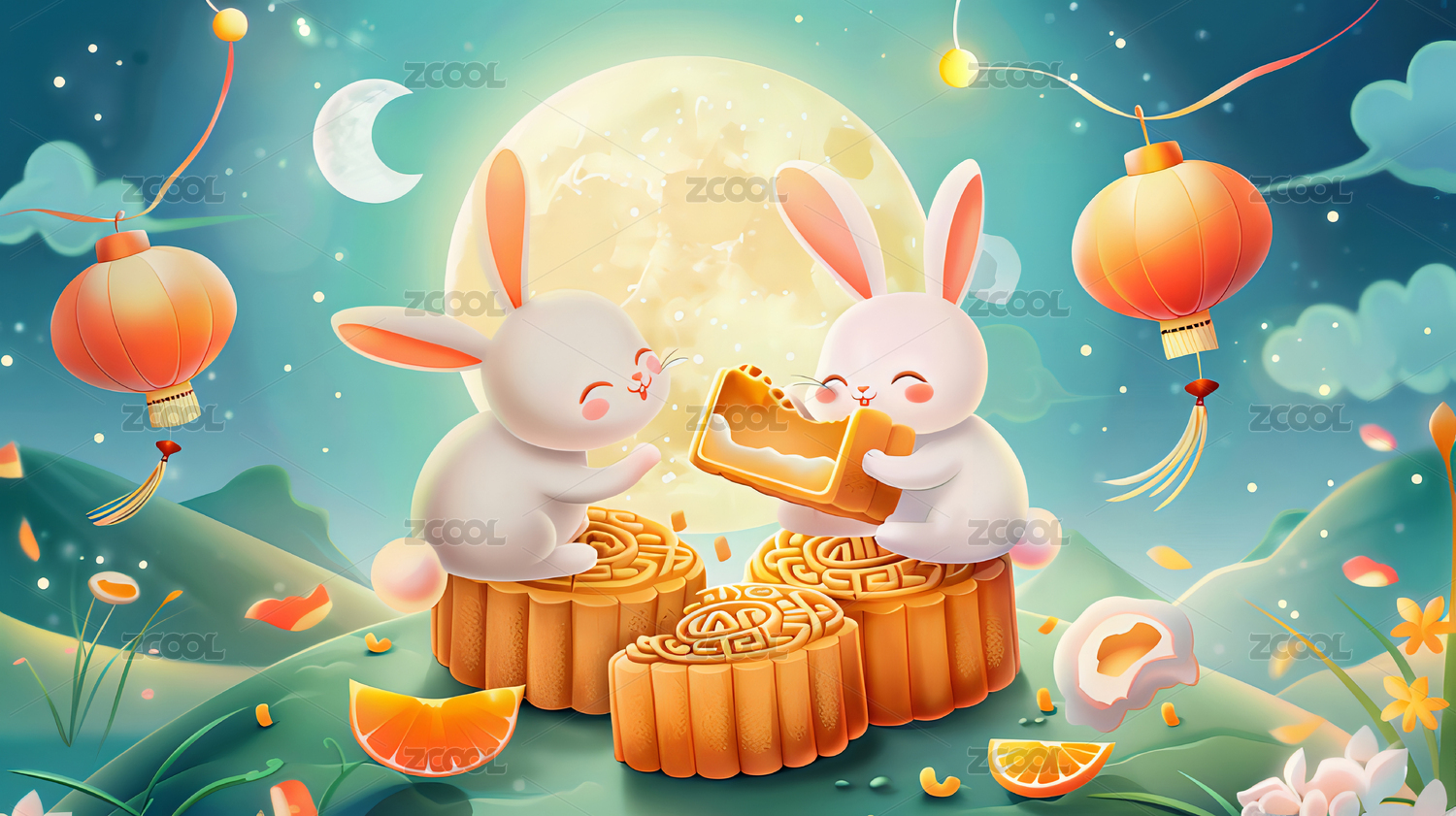 中秋节满月背景下正在吃月饼的可爱玉兔
