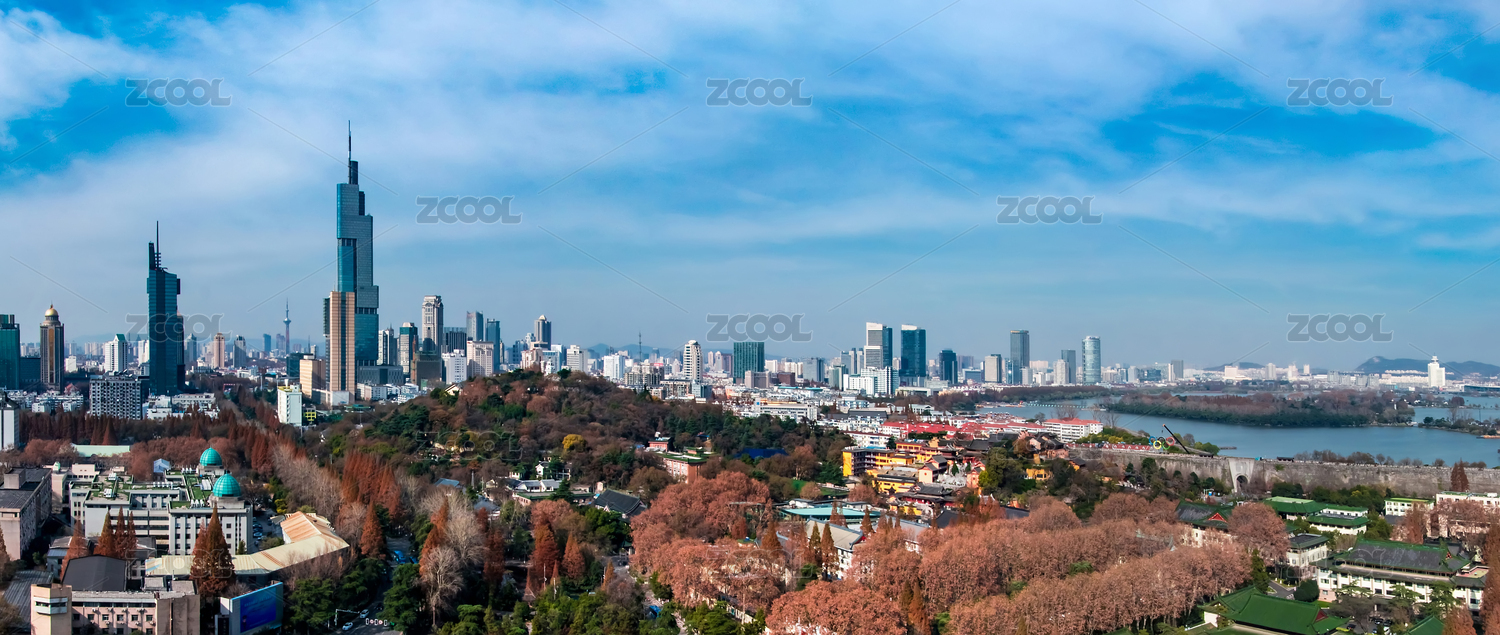 航拍耸立在玄武湖边的中国江苏南京紫峰大厦