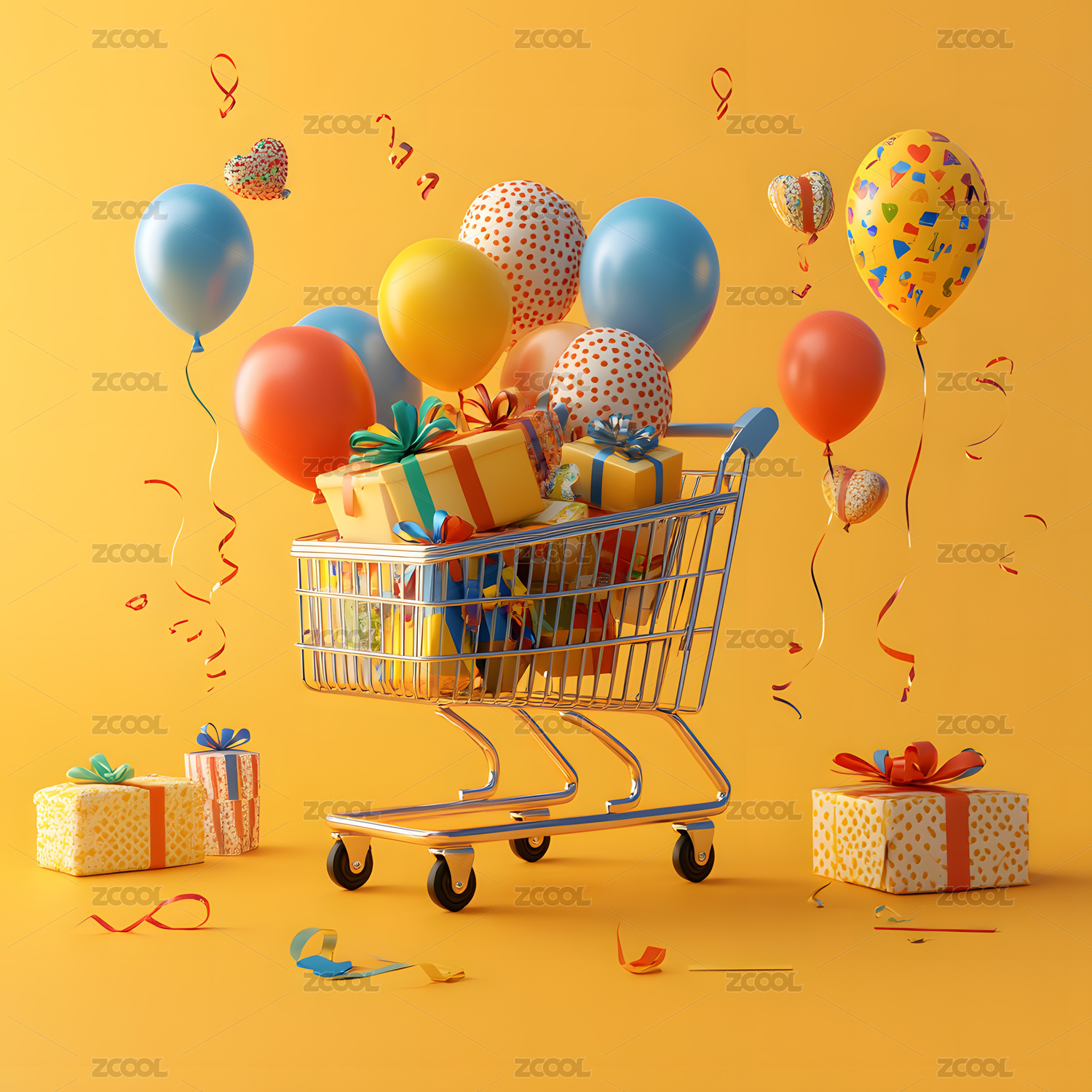 购物节,购物车,活动,插画,黄色背景,气球,电商,促销
