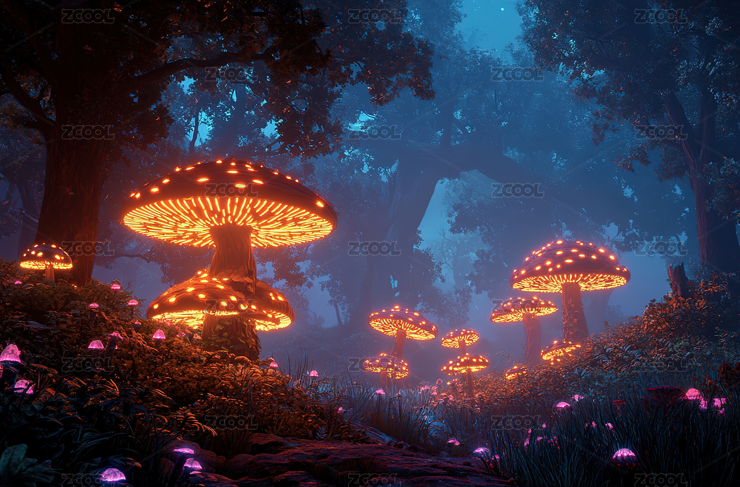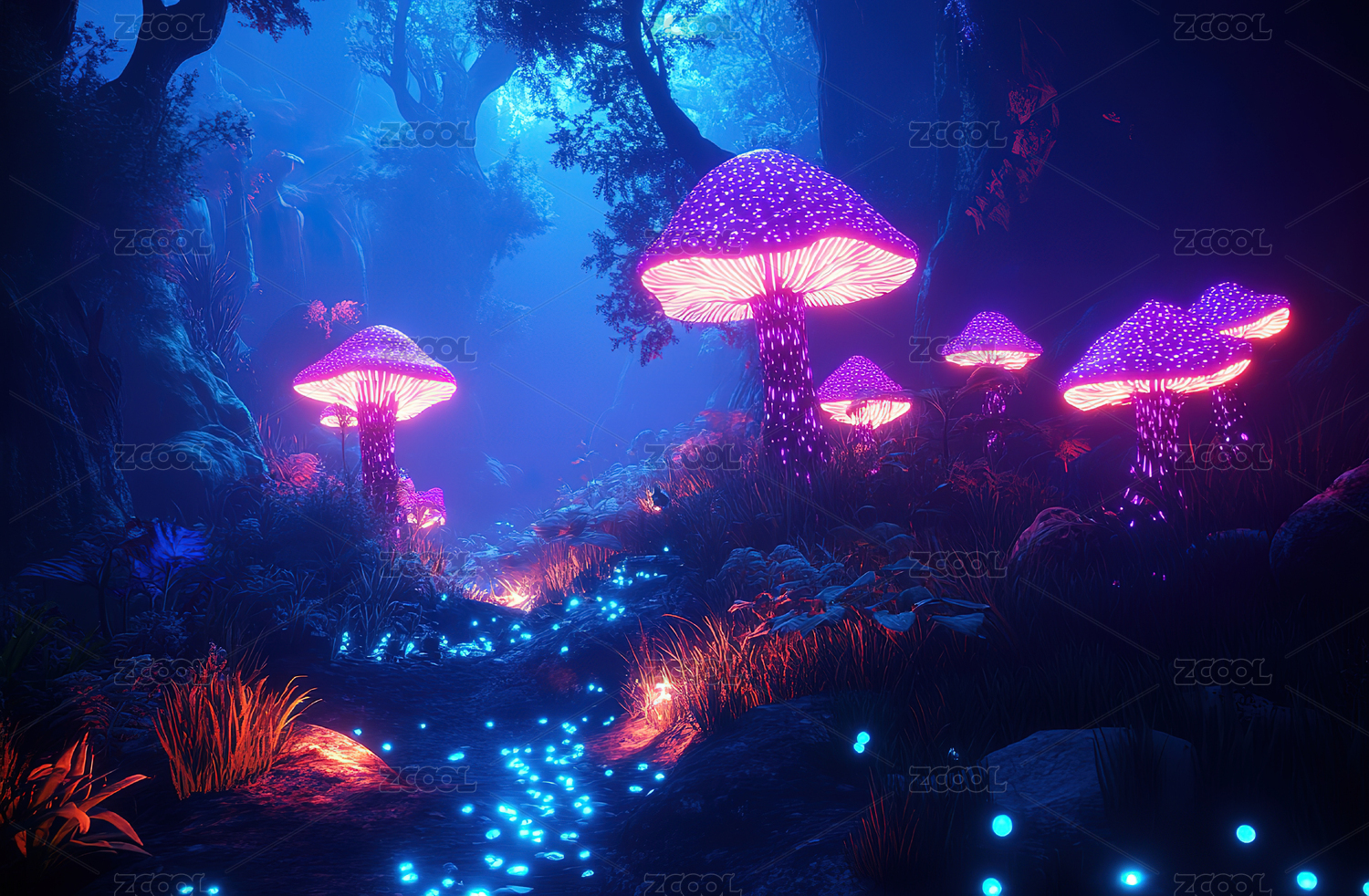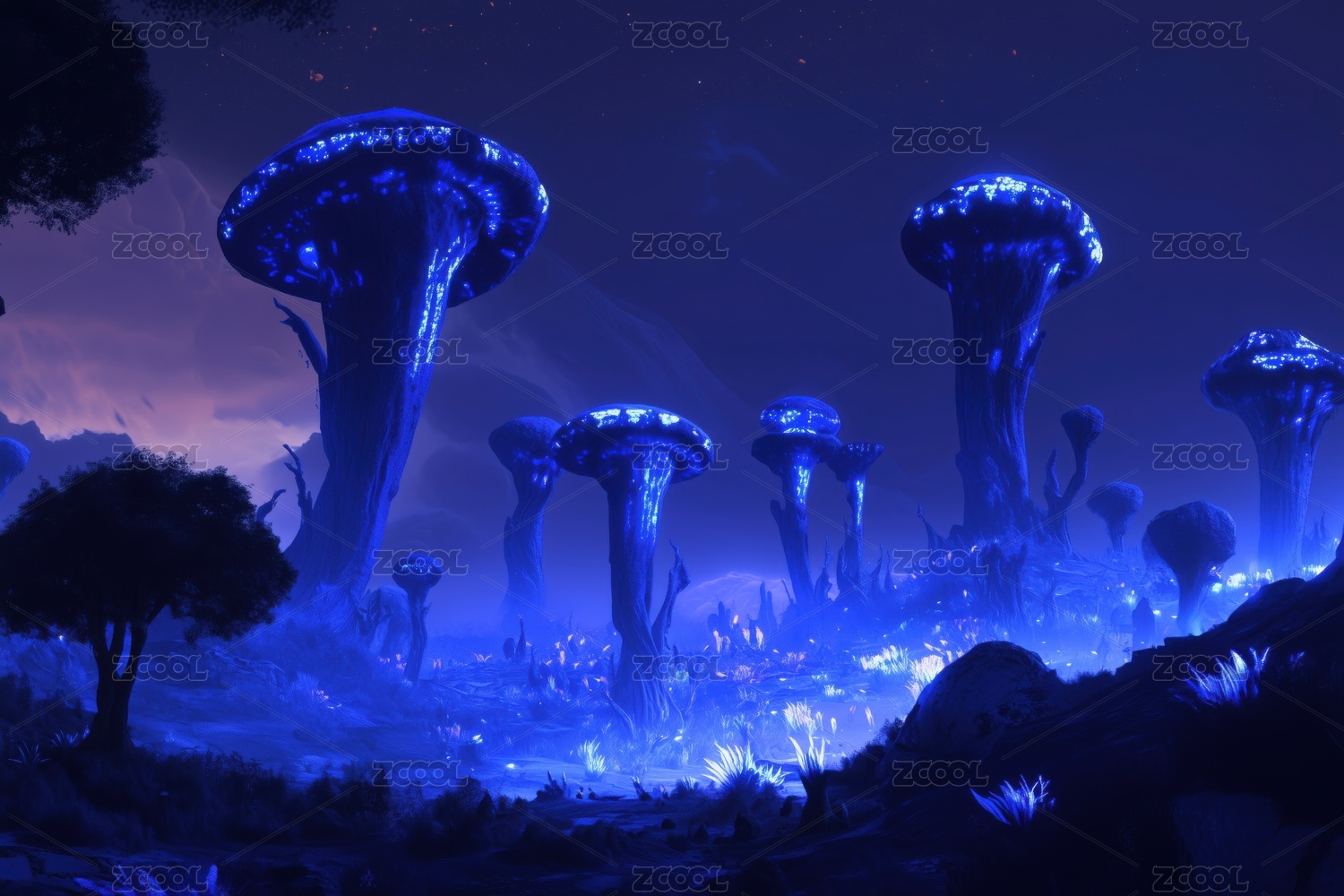 科幻奇幻夜晚外星球地理发光植被3D插画