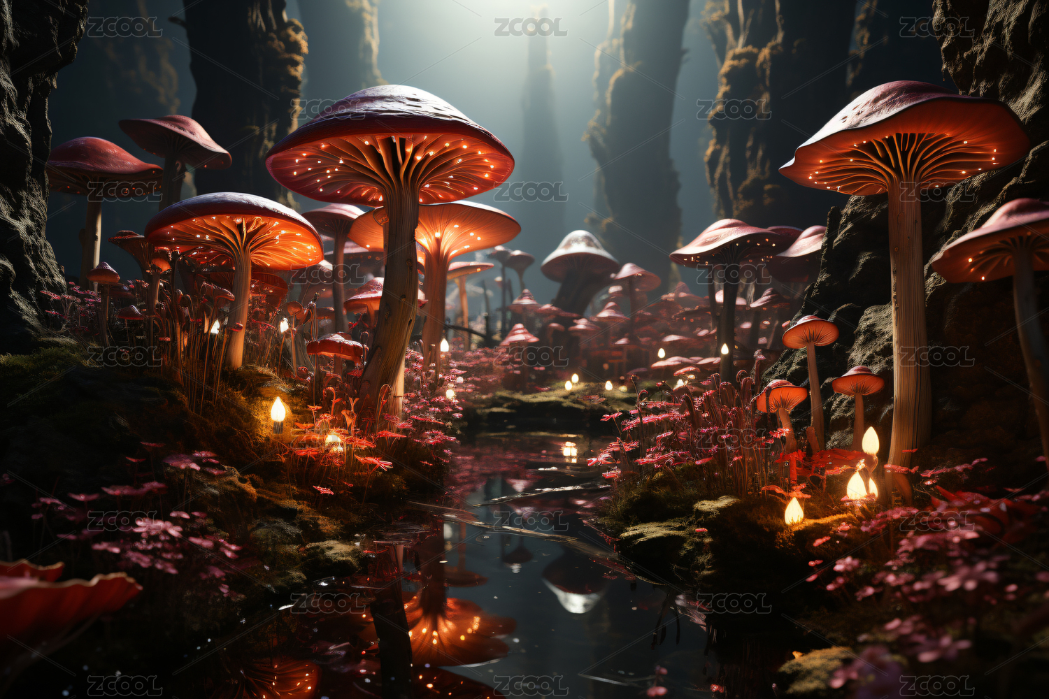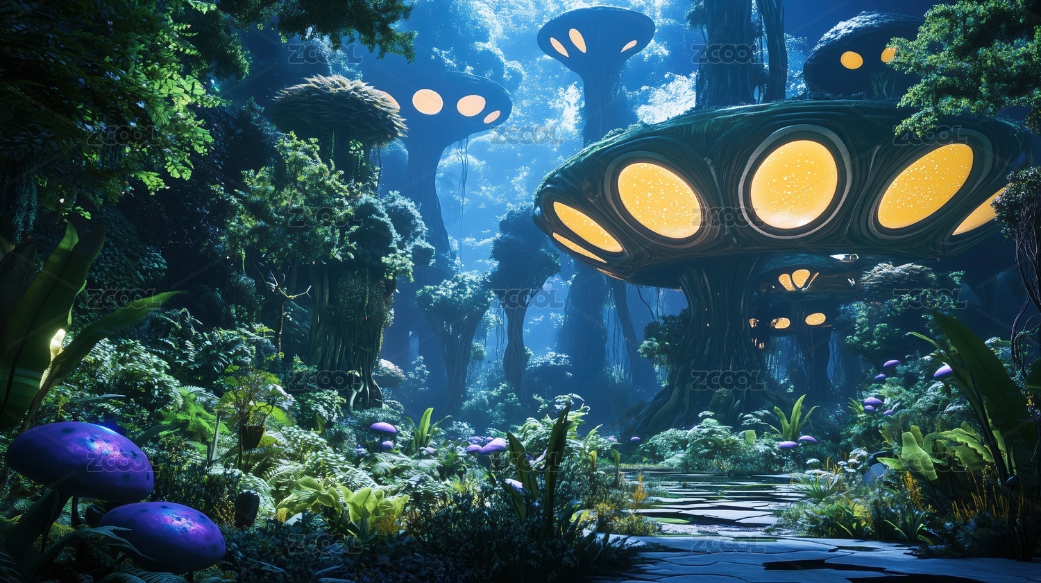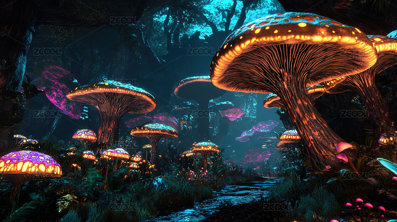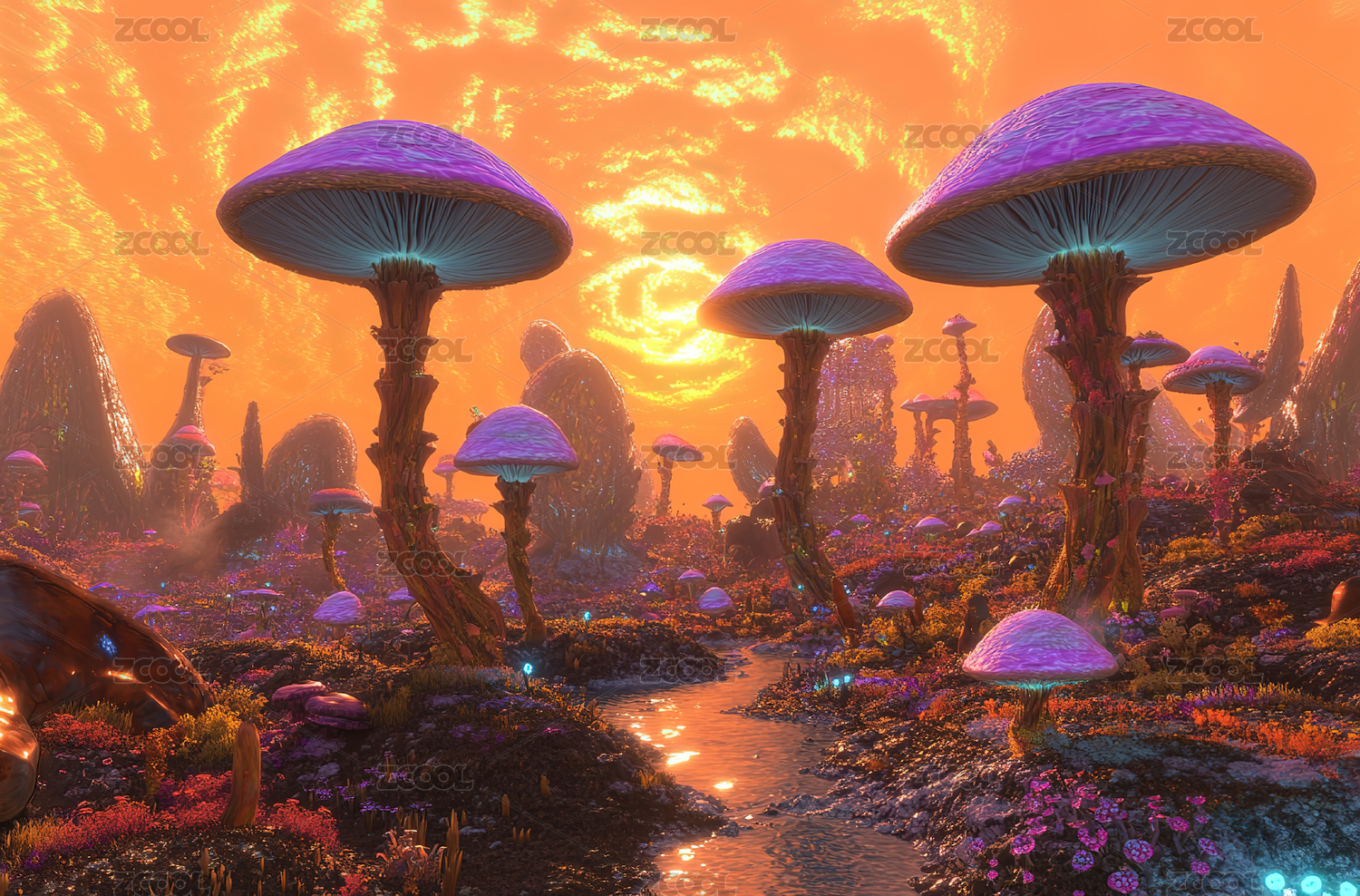 科幻奇幻夜晚外星球地理发光植被3D插画