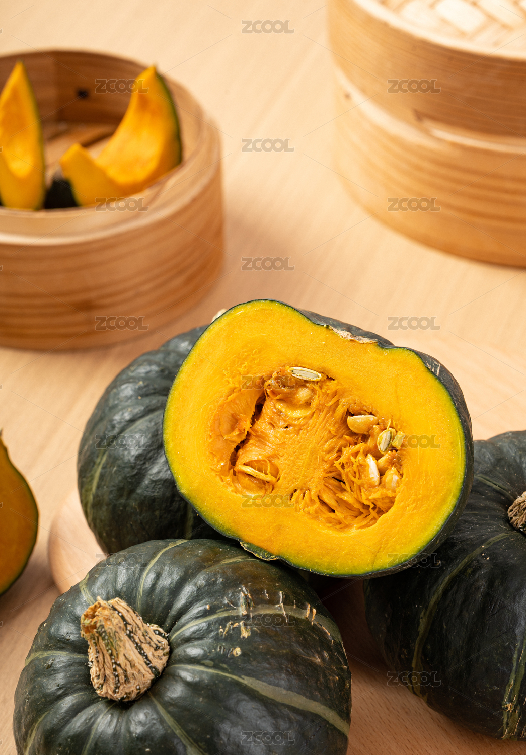 中式复古场景中切开放在桌子上的贝贝小南瓜