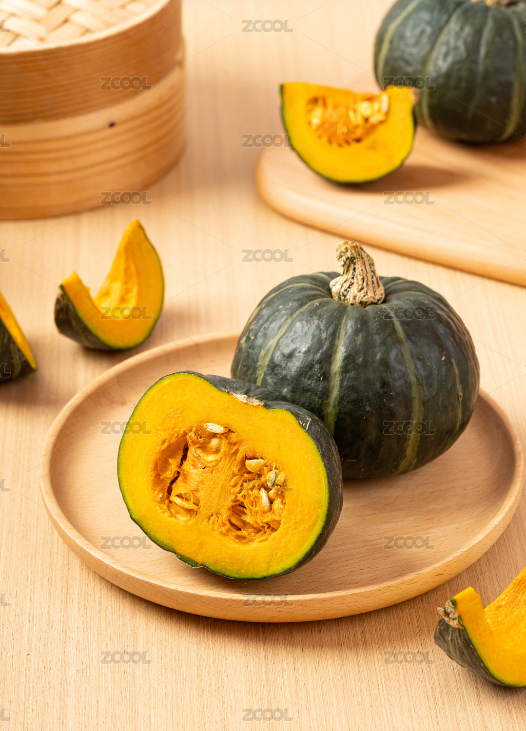 中式复古场景中切开放在桌子上的贝贝小南瓜