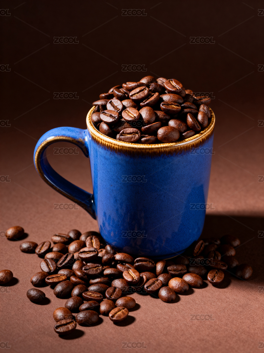 蓝色杯子装满咖啡豆