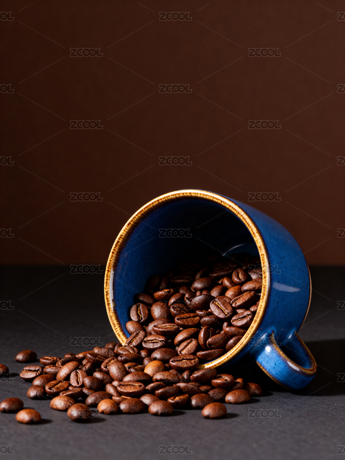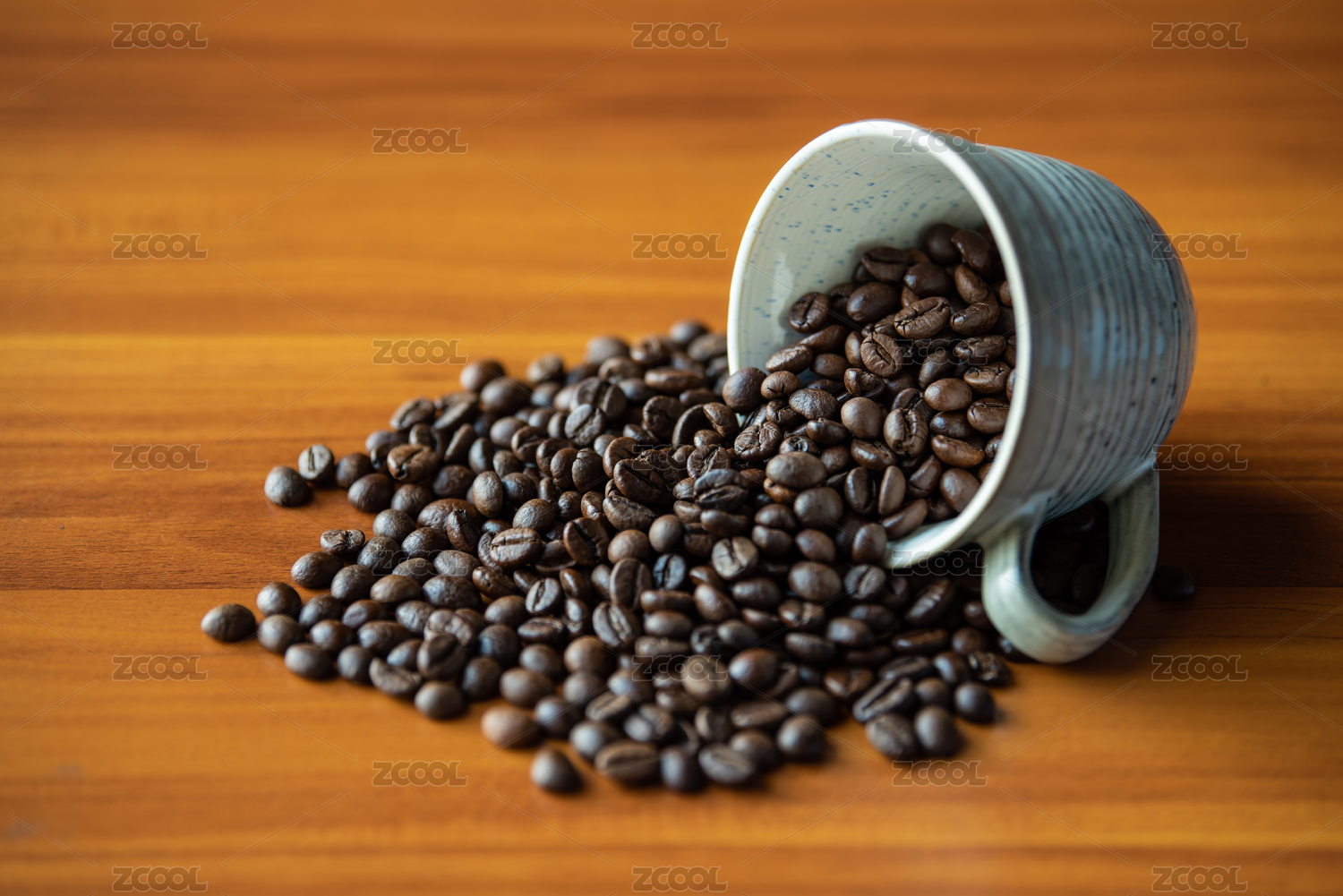 蓝色陶瓷杯倾倒咖啡豆特写