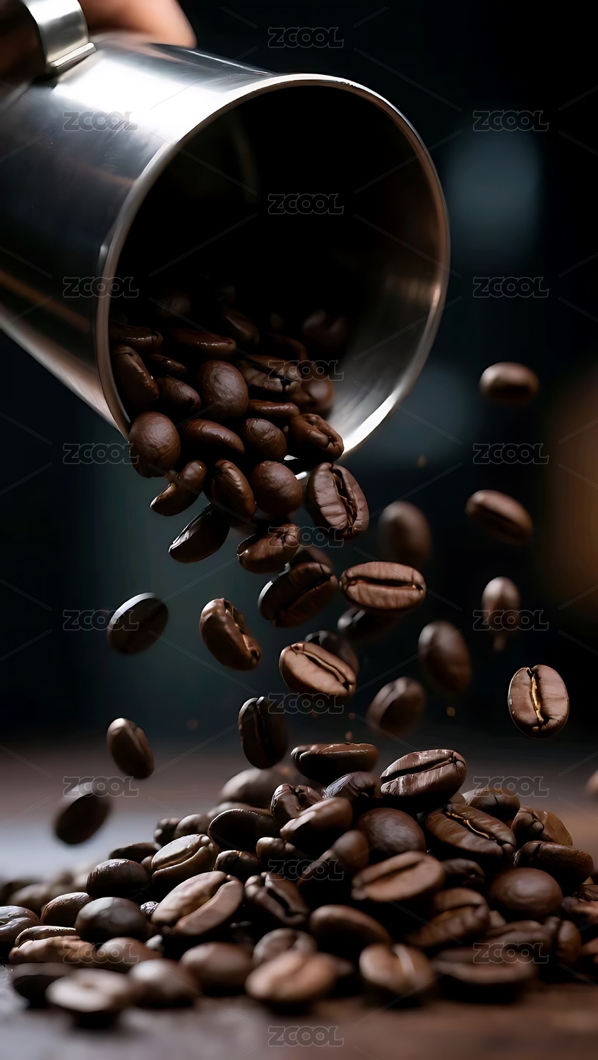 黑色背景中杯子倒出来的咖啡豆