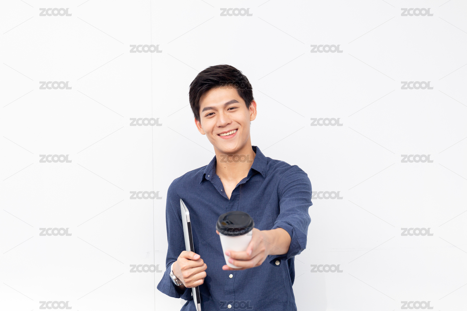 一手抱着笔记本电脑一手拿着咖啡杯商务男士